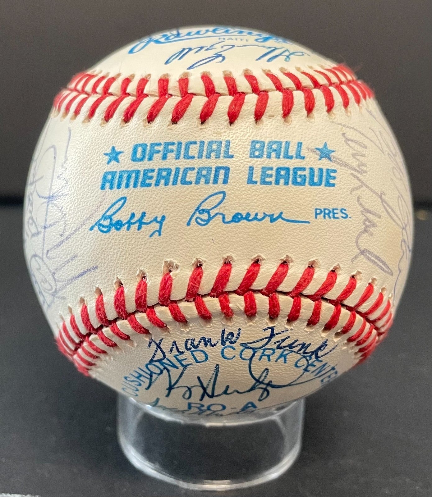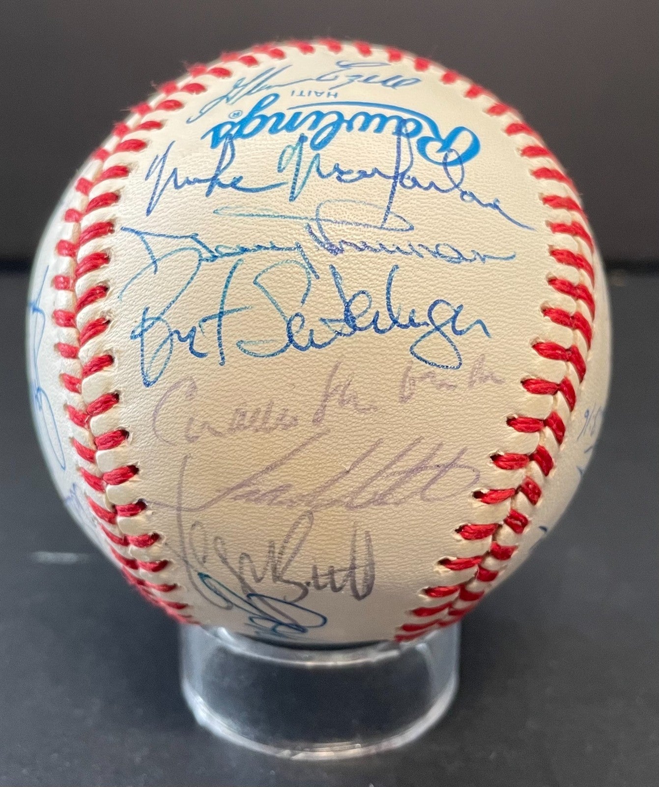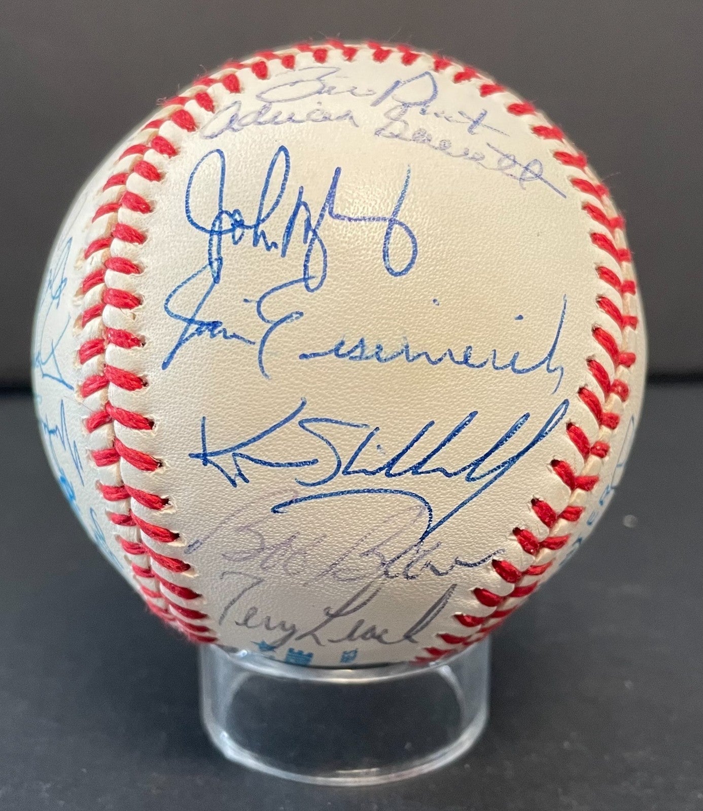 - Signatures include: John Wathan MGR SS, George Brett, Bob Schaefer coach, Tom Gordon, Mark Gubicza, Floyd Bannister, Jeff Montgomery, Frank Funk, Steve Farr, Pat Tabler, Jim Heaton, Brad Wells, Luis Aquino, Mike Lum, Terry Leach, Bob Boone, Kurt Stillwell, Jim Eisenreich, John Mayberry coach, Adrian Garrett coach, Bill Pecota, Glenn Ezell, Mike Macfarlane, Gary Thurmann and Bret Saberhagen
