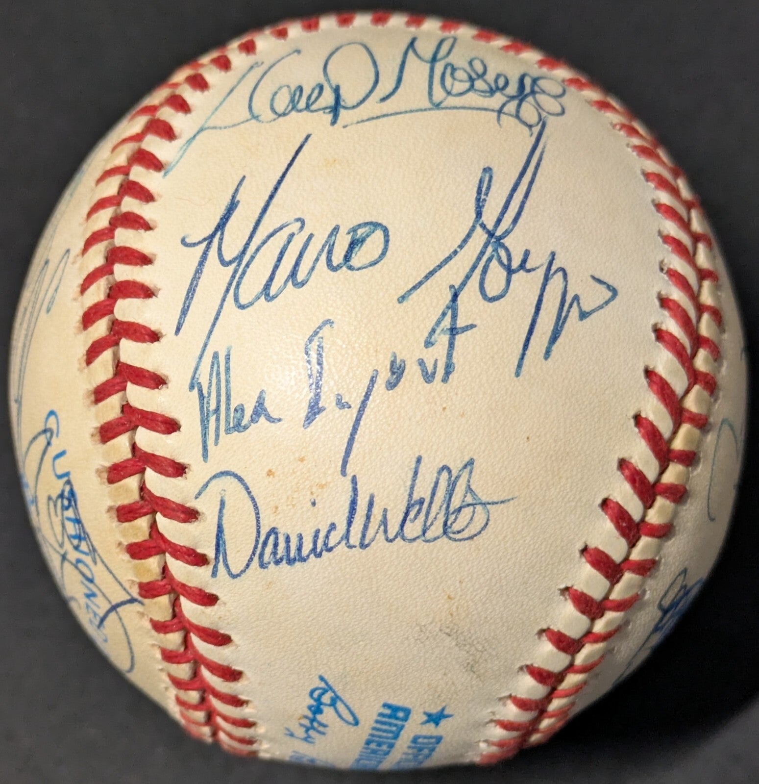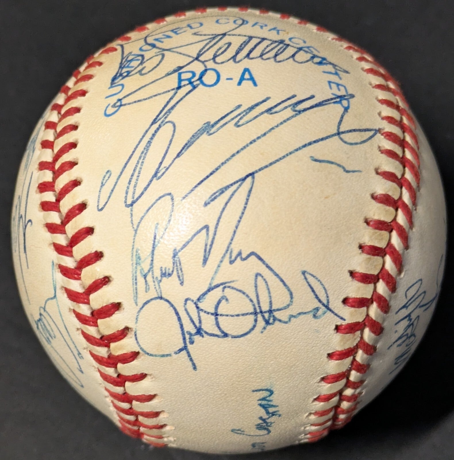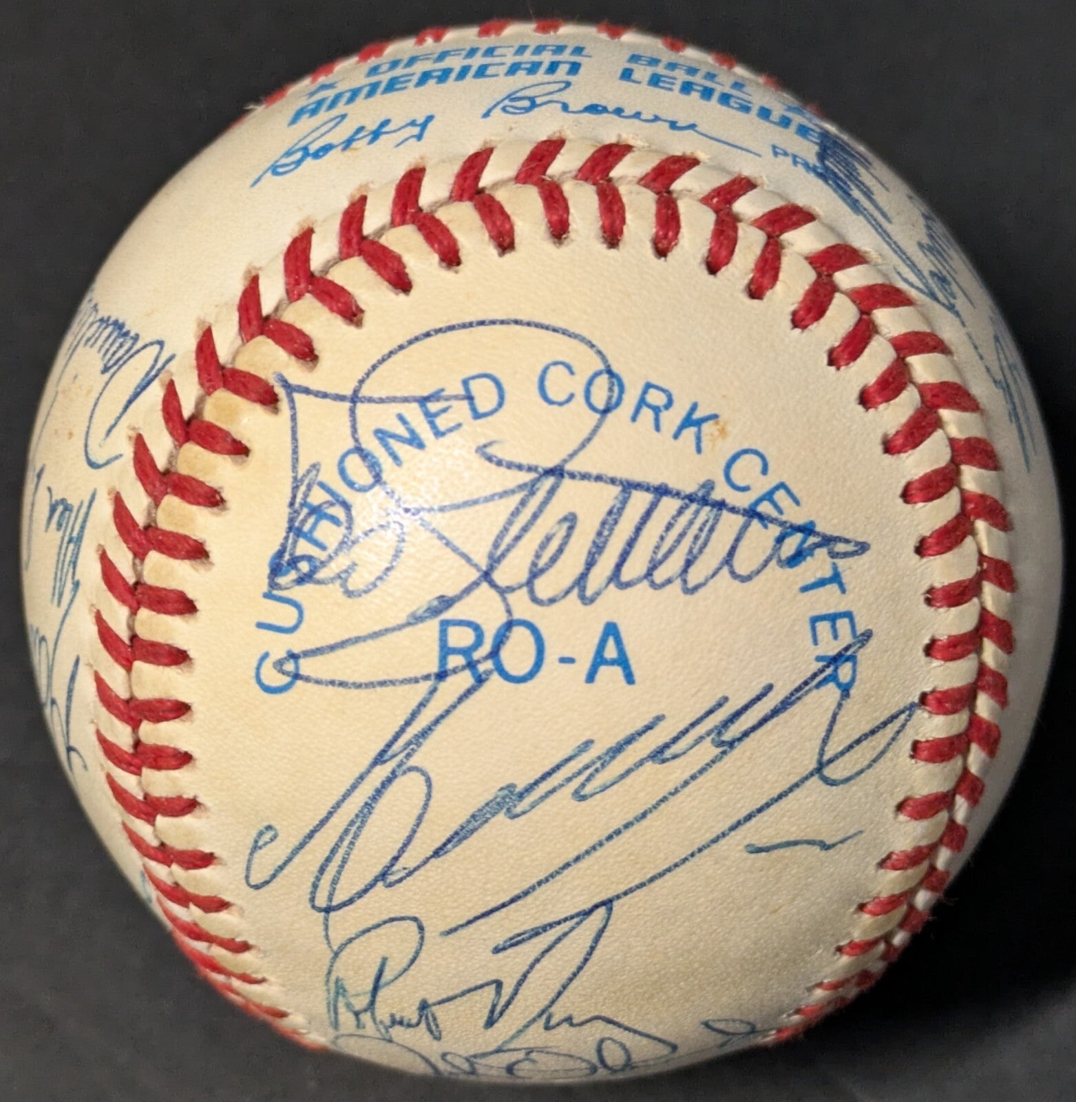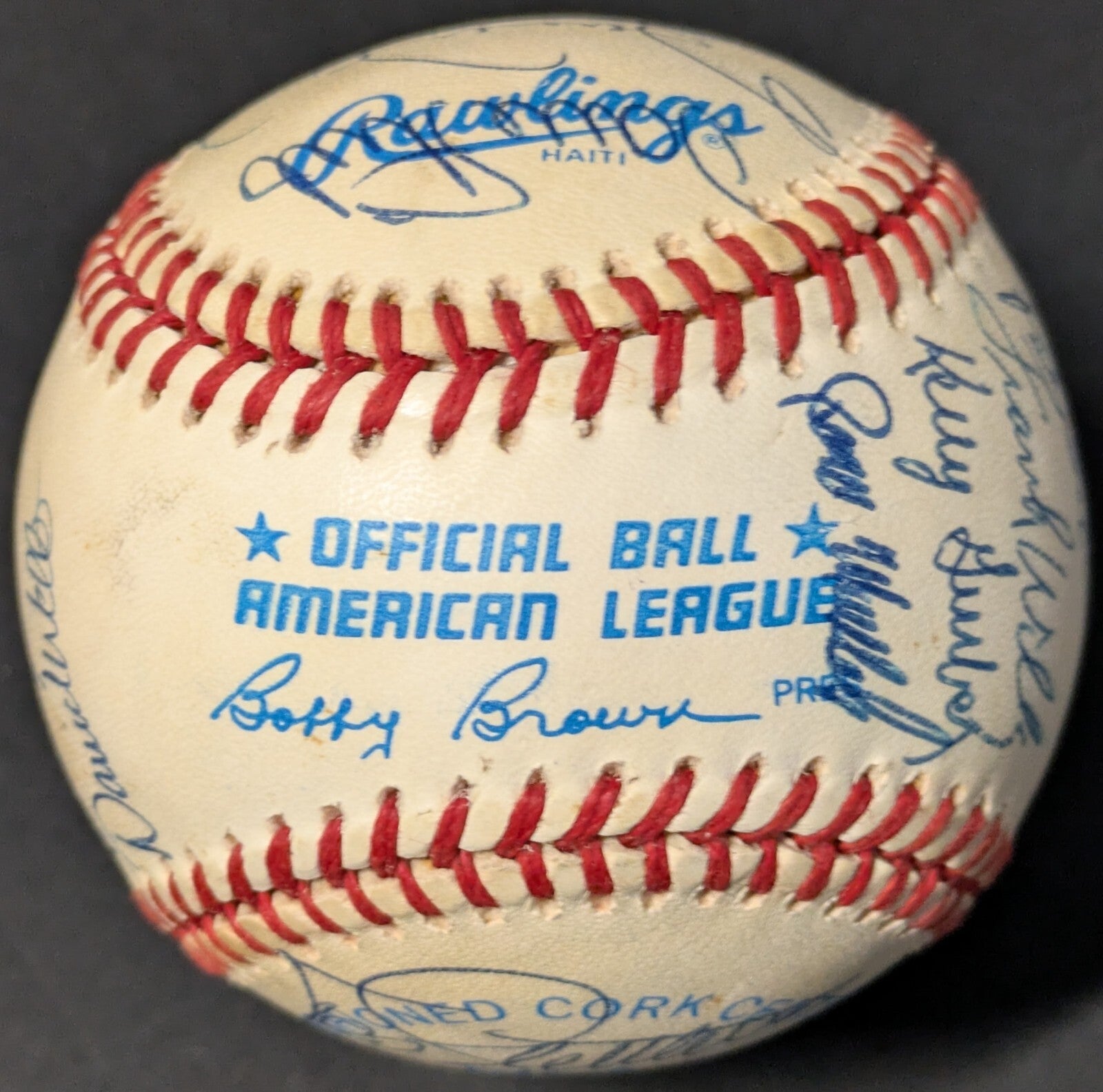• Team signed official A.L. Bobby Brown ball signed by Todd Stottlemyre, Manny Lee, Rob Ducey, John Olerud, Cito Gaston on sweet spot, George Bell, Nelson Liriano, Tom Henke, Duane Ward, Dave Stieb, Fred McGriff, Jimmy Key, Greg Myers, Al Leiter, Pat Borders, Frank Wills, Kelly Gruber, Rance Mulliniks, David Wells, Alex Infante, Mauro Gozzo, Llyod Mosby and 1 other