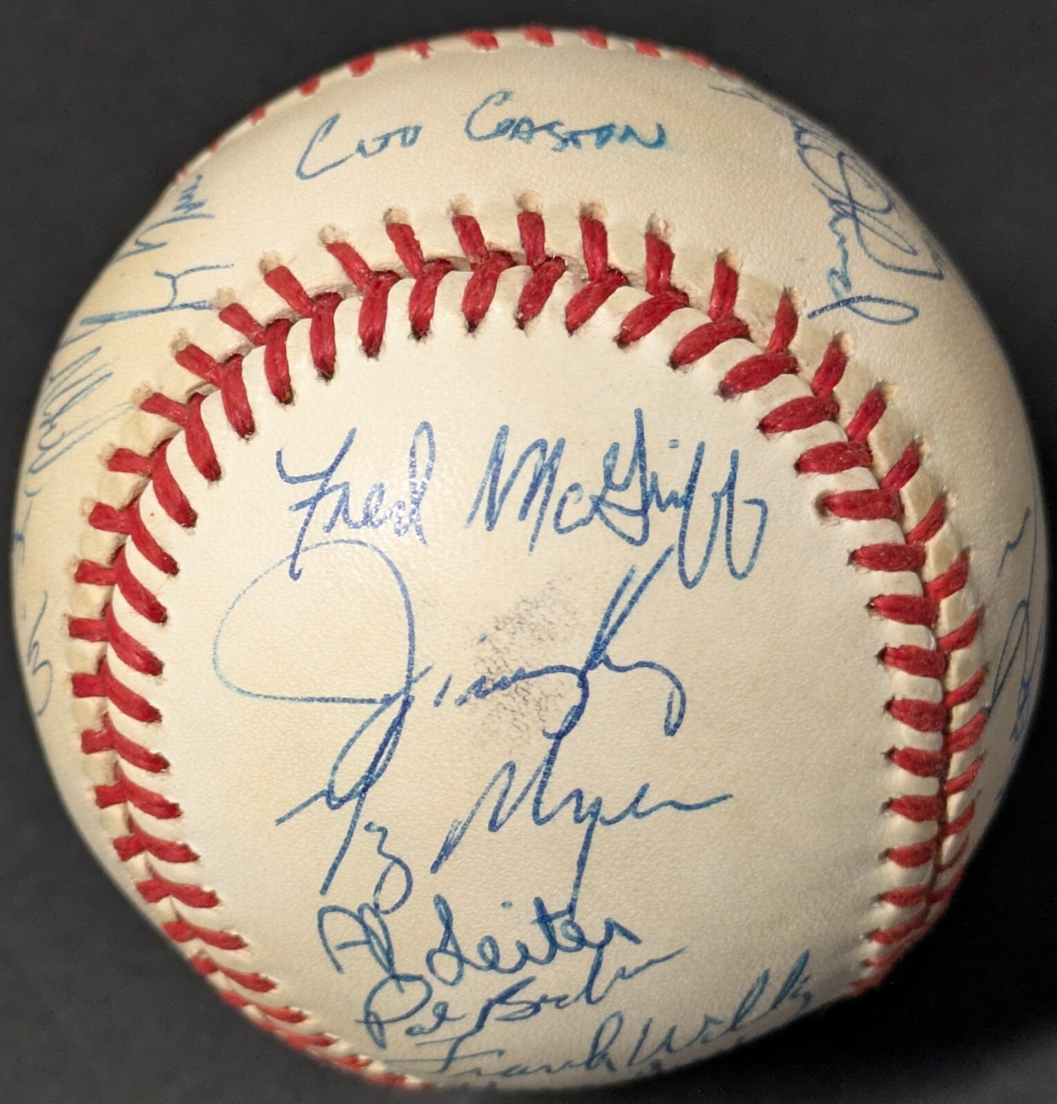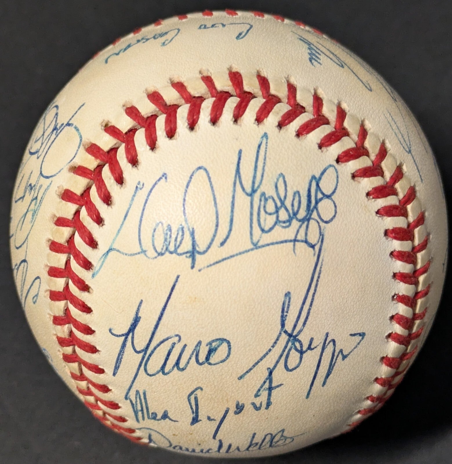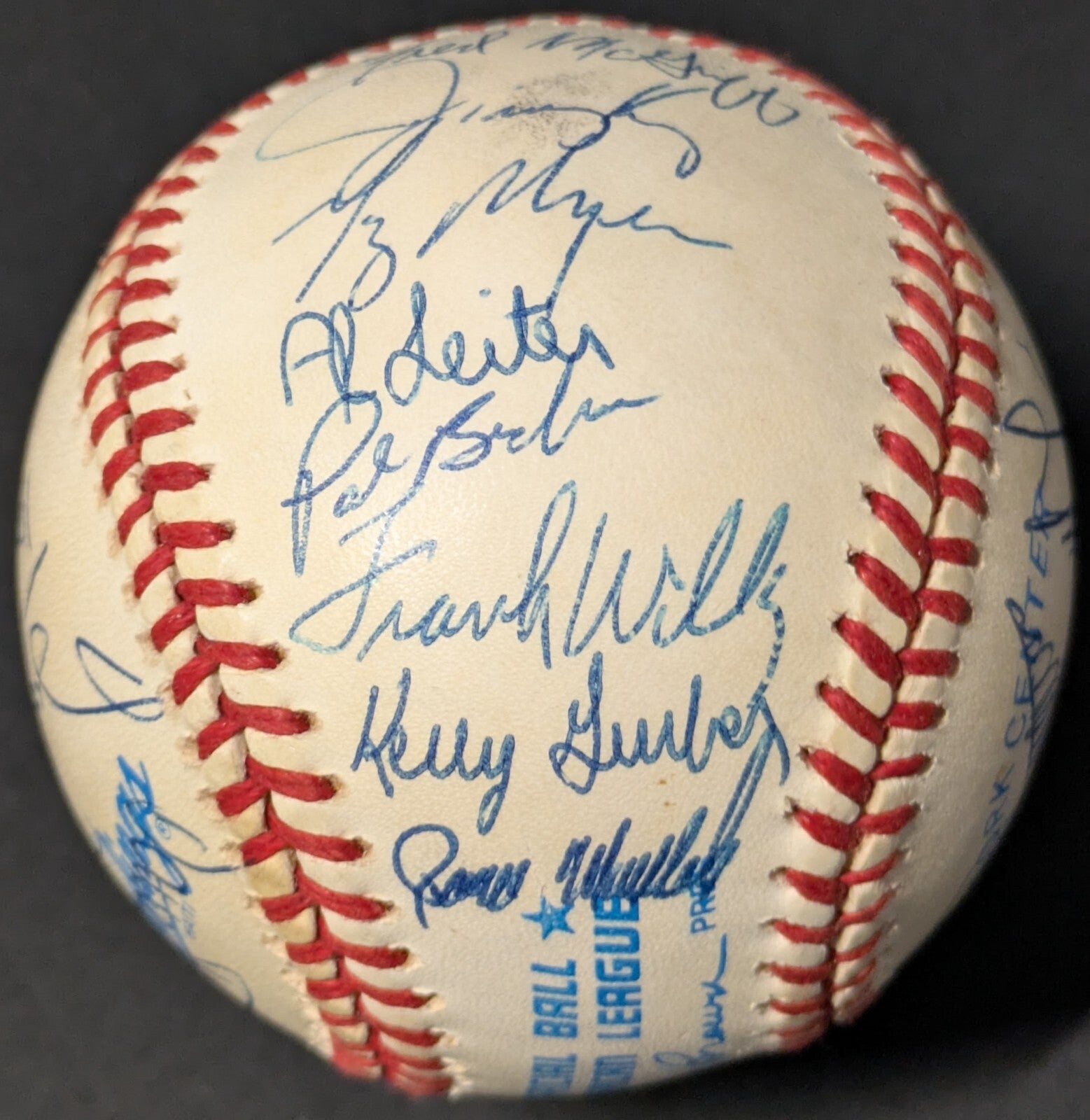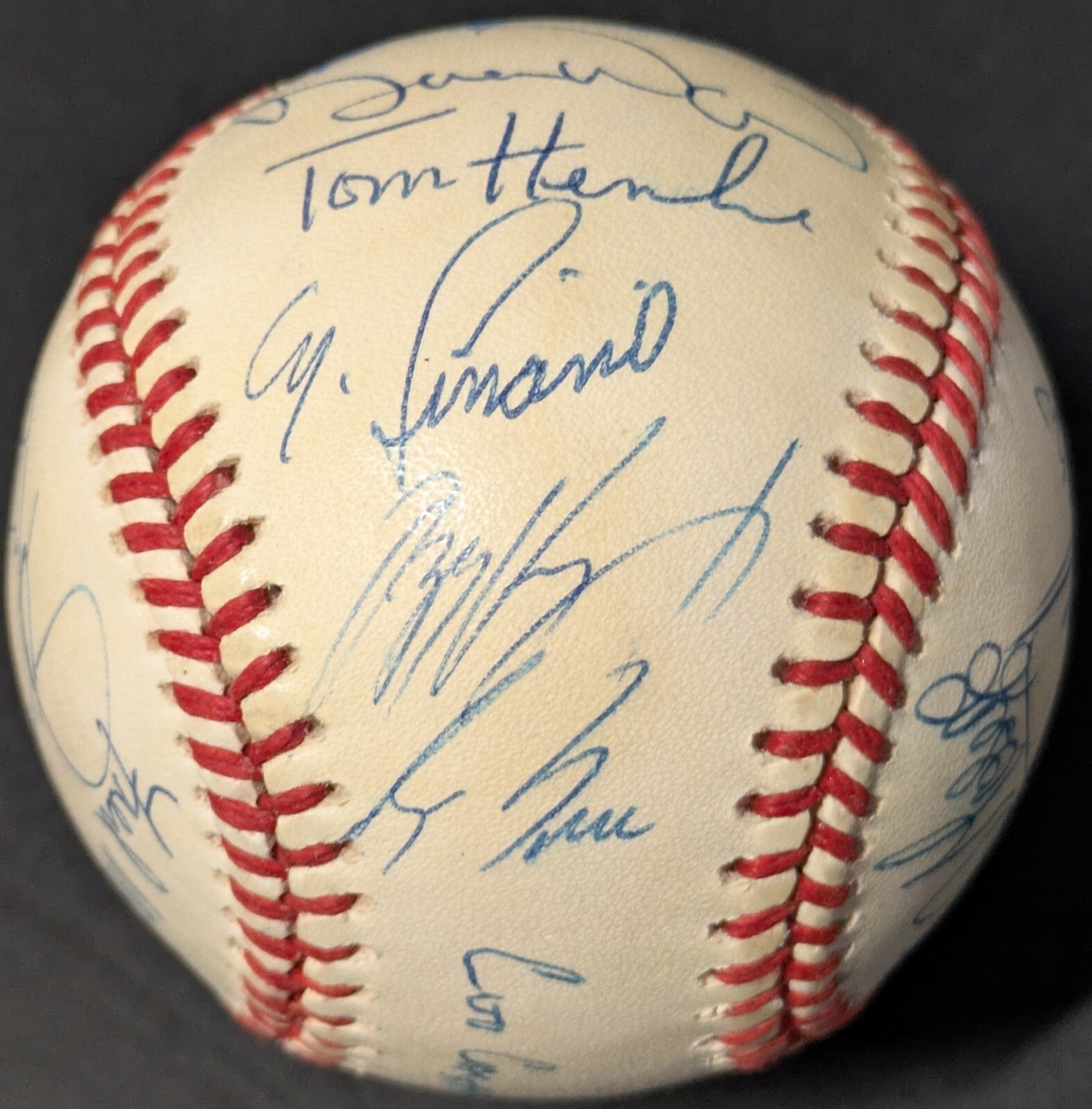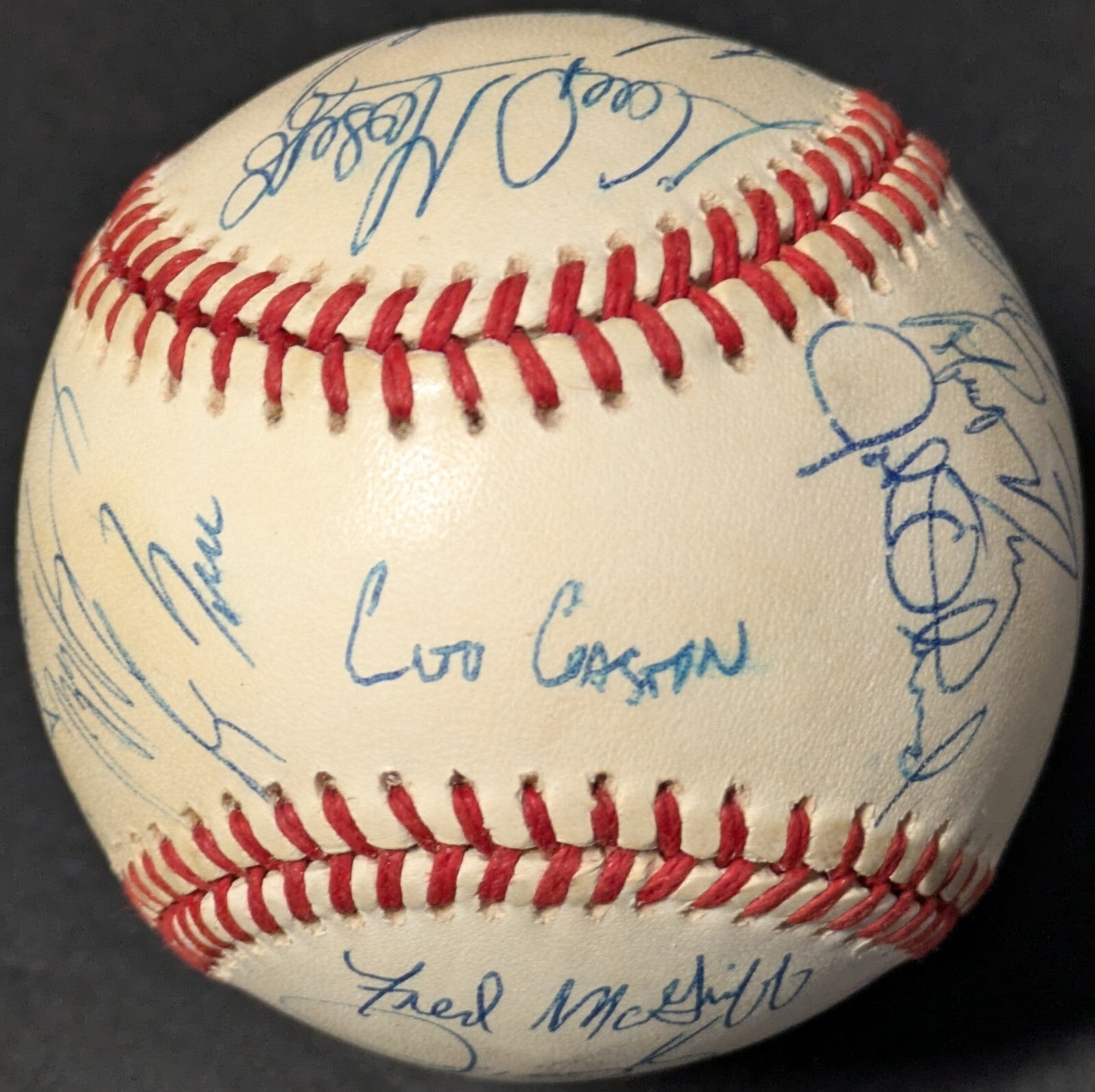 • Team signed official A.L. Bobby Brown ball signed by Todd Stottlemyre, Manny Lee, Rob Ducey, John Olerud, Cito Gaston on sweet spot, George Bell, Nelson Liriano, Tom Henke, Duane Ward, Dave Stieb, Fred McGriff, Jimmy Key, Greg Myers, Al Leiter, Pat Borders, Frank Wills, Kelly Gruber, Rance Mulliniks, David Wells, Alex Infante, Mauro Gozzo, Llyod Mosby and 1 other