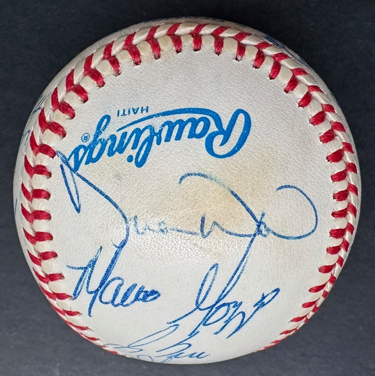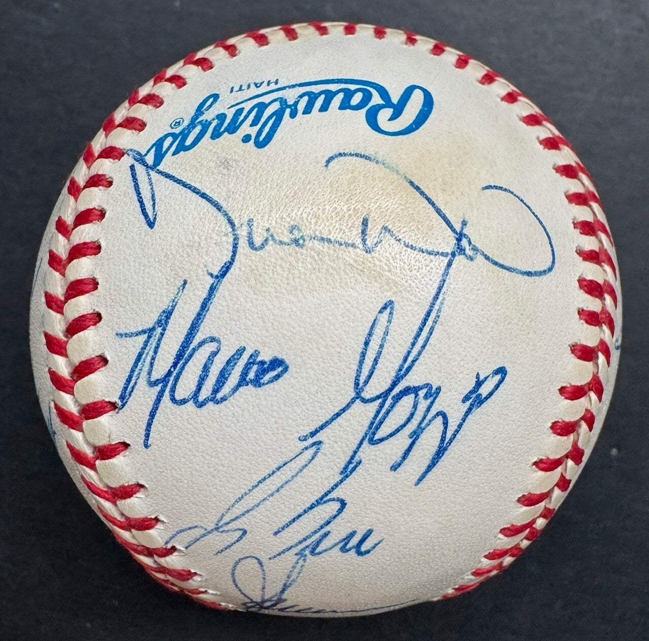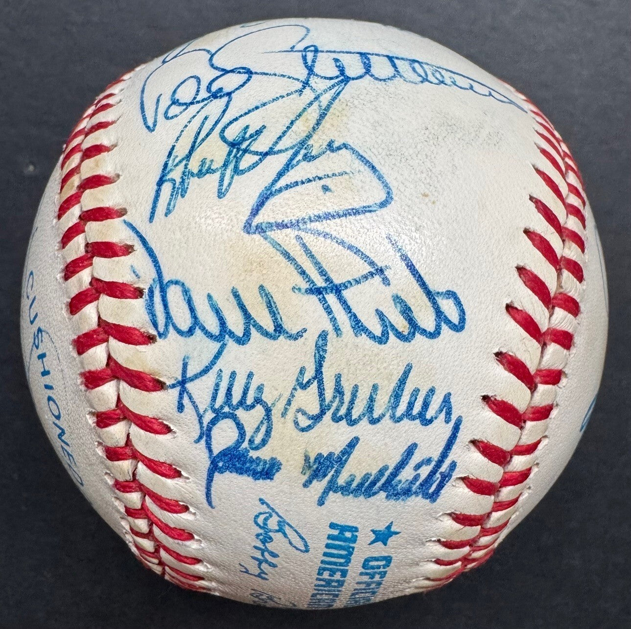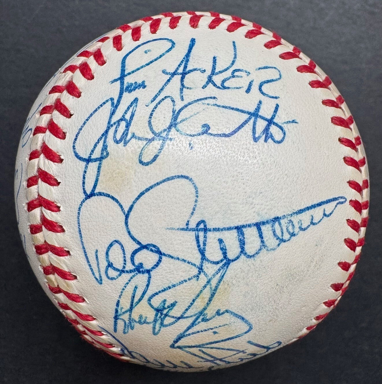 • Signatures of Jimmy Key, Tom Lawless, Ernie Witt, Nelson Liriano, Pat Borders, David Wells, Cito Gaston manager, John Sullivan coach, George Bell, Mauro Gozzo, Duane Ward, John McLaren coach, Mookie Wilson, Tom Henke, Lloyd Moseby, Jeff Musselman, HOFer Fred McGriff, Rance Mulliniks, Kelly Gruber, Dave Stieb, Rob Ducey, Todd Stottlemyre, John Cerutti and Jim Acker