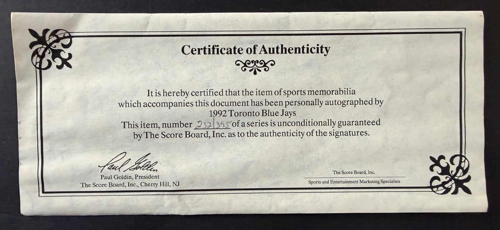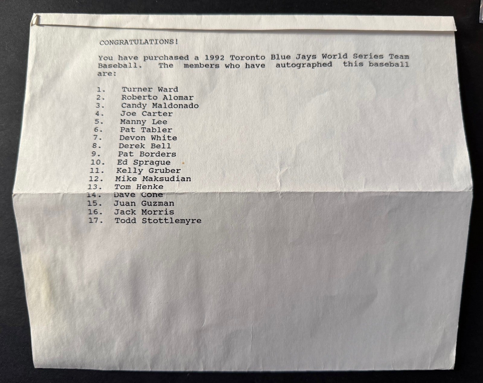 - Signatures include: Turner Ward, Roberto Alomar, Candy Maldonado, Joe Carter, Manny Lee, Pat Tabler, Devon White, Derek Bell, Pat Borders, Ed Sprague, Kelly Gruber, Mike Maksudian, Tom Henke, Dave Cone, Juan Guzman, Jack Morris and Todd Stottlemyre