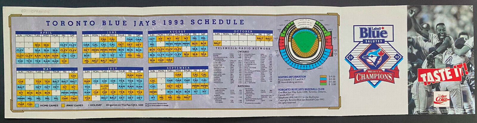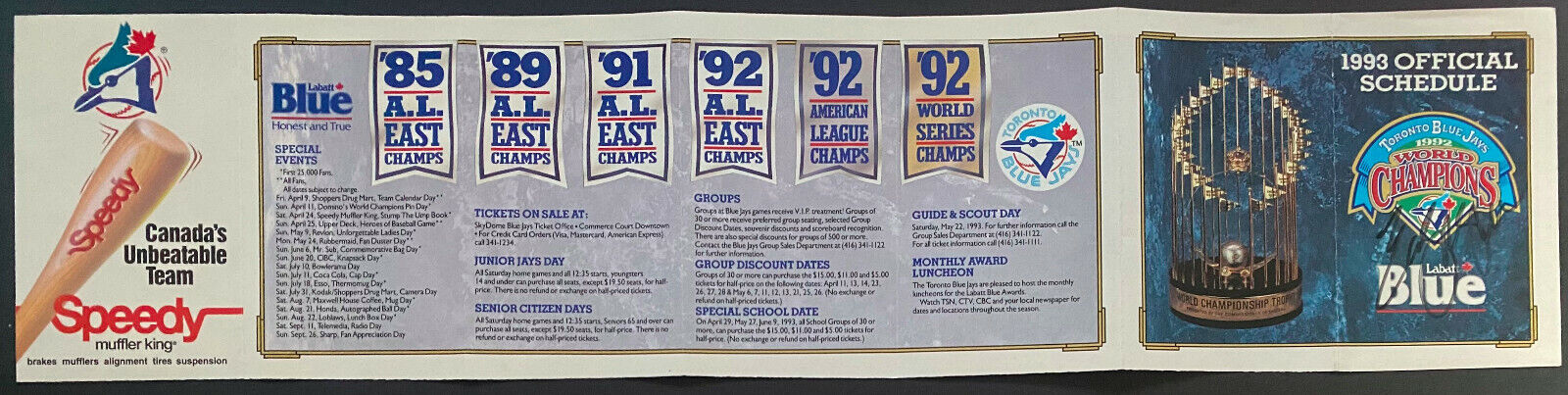 - 1993 Toronto Blue Jays World Champions Ed Sprague Signed Autographed MLB Baseball Schedule