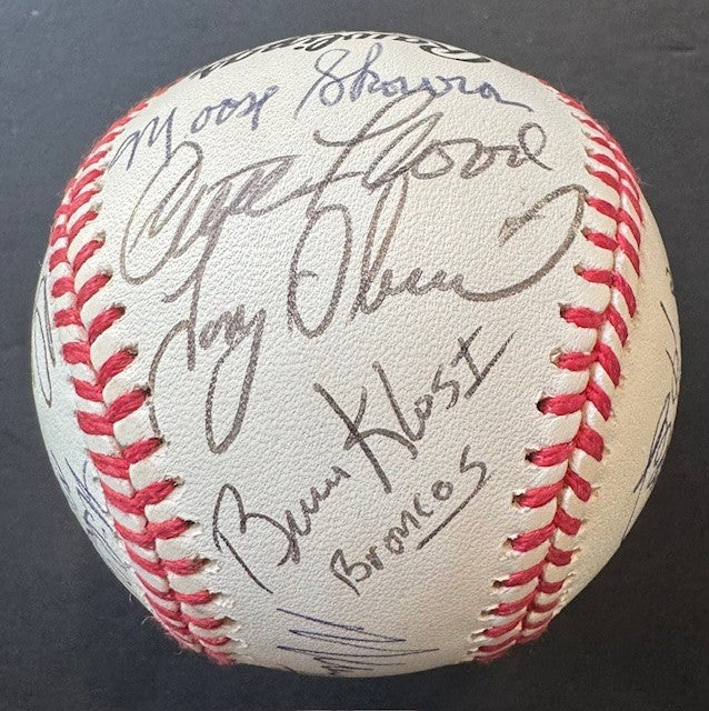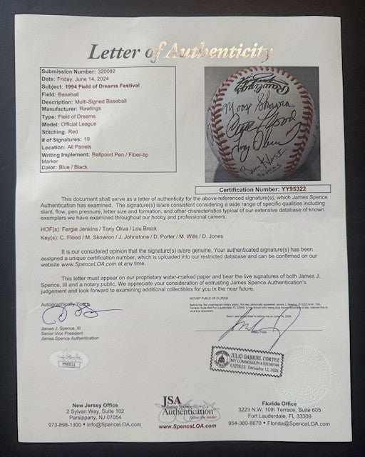 - Signatures include: Fergie Jenkins, Tony Oliva, Curt Flood, Lou Brock, Bill "Moose" Skowron, Bruce Klostermann, Maury Wills, Gary Bell, Jay Johnstone, Tom Paciorek, Mike Haight, Dalton Jones, Gary Matthews, Joe Hoerner, Julio Becquer, Don Denkinger, Sandy Alomar Sr., Darrell Porter and Cal Eldred