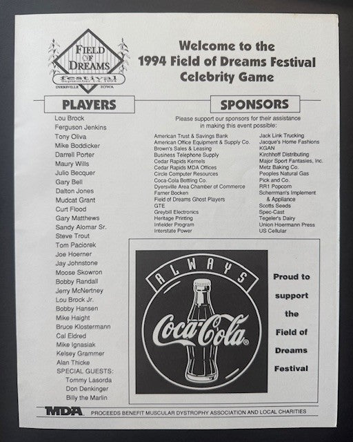 - 1994 Field of Dreams Festival celebrity game team signed x19 baseball + program including three Baseball Hall of Famers