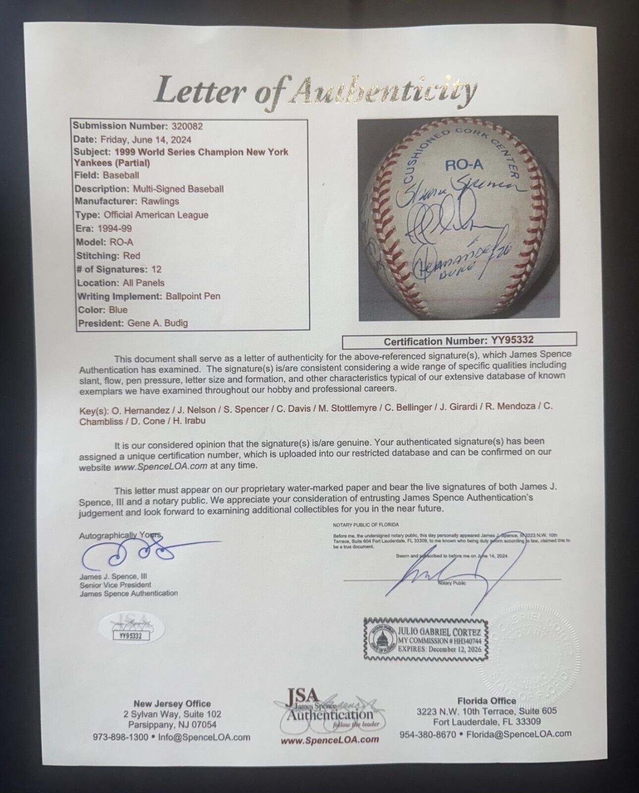 - On an official Rawlings Budig-era American League baseball signed by 12 membes of the World Series Champion 1999 New York Yankees, including: Orlando Hernandez, Jeff Nelson, Shane Spencer, Chili Davis, Mel Stottlemyre, Clay Bellinger, Joe Girardi, Ramiro Mendoza, Chris Chambliss, Dave Cone and Hideki Irabu