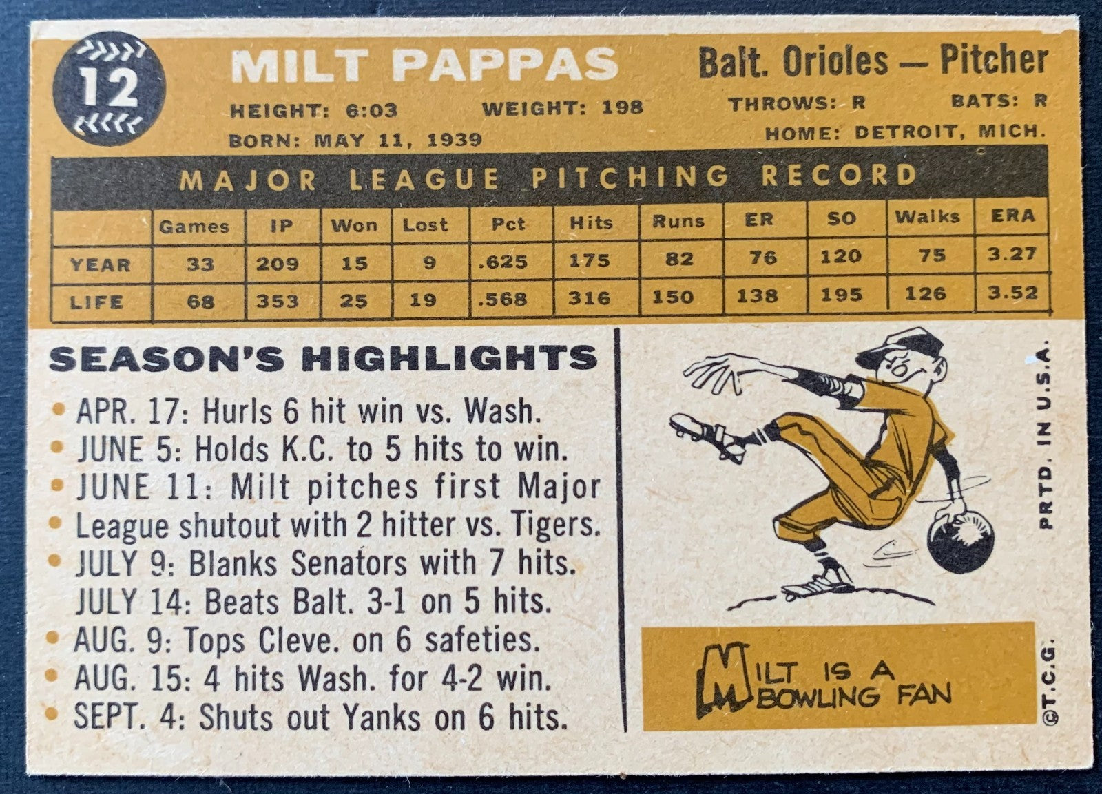 - 1960 Topps #12 Milt Pappas Baltimore Orioles Baseball Card