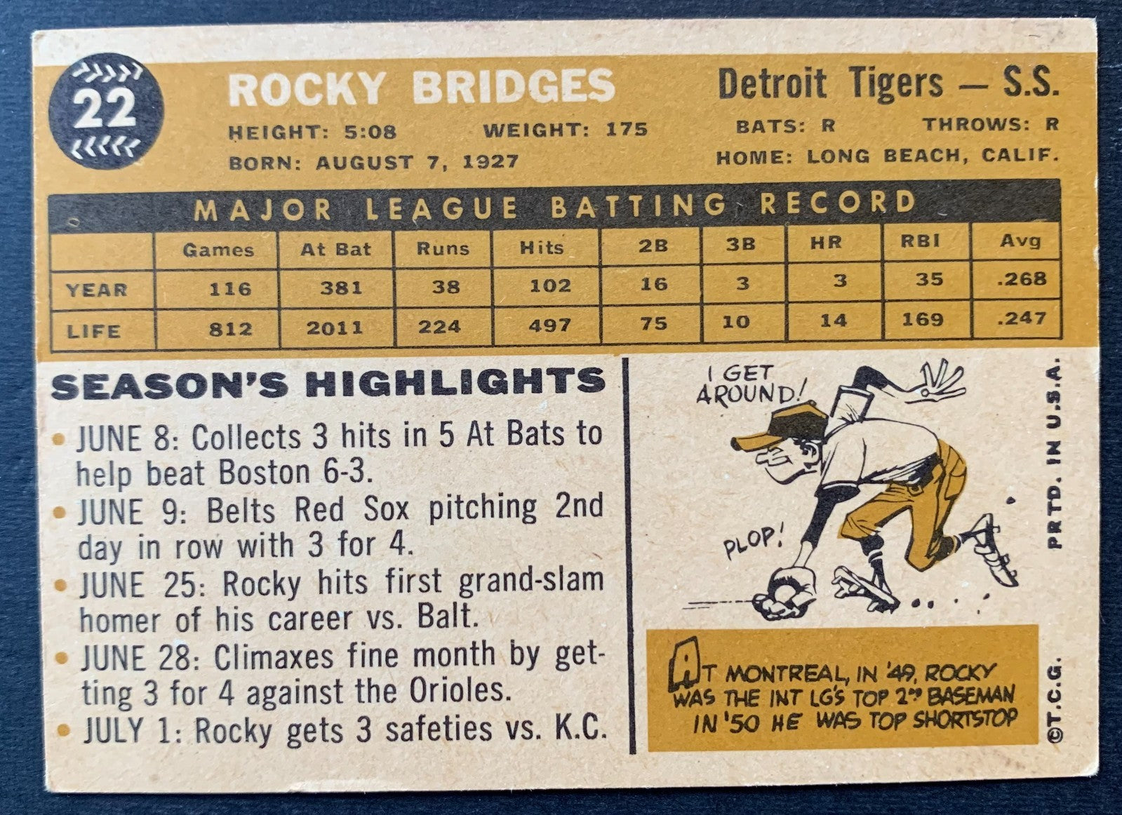 - 1960 Topps #22 Rocky Bridges Detroit Tigers Baseball Card MLB Infielder