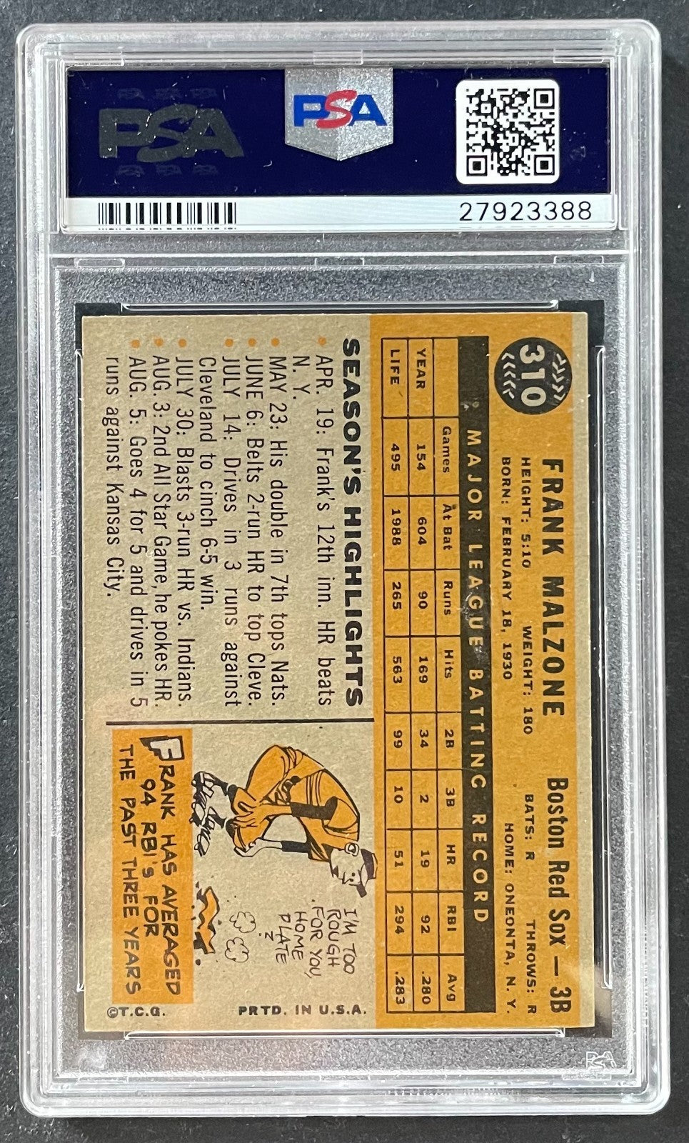 • 1960 Topps #310 Frank Malzone Boston Red Sox Baseball Card PSA VG 3 MLB