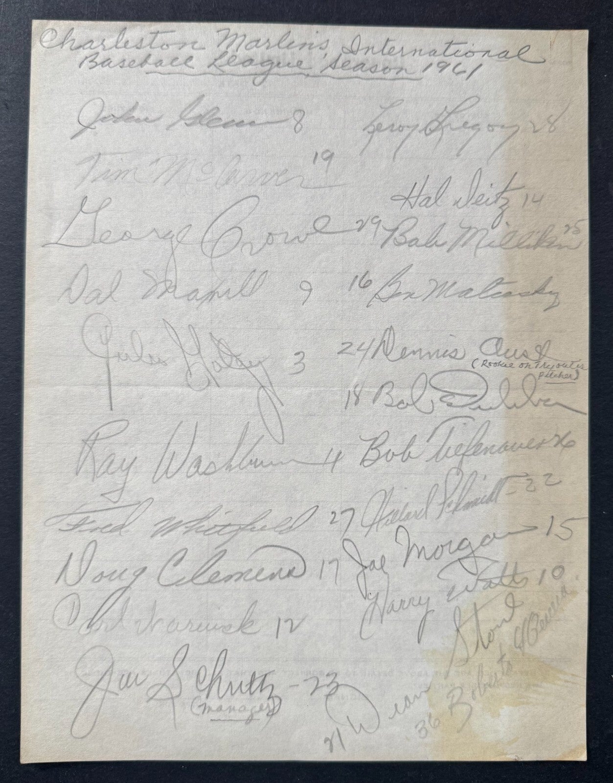 - Marlins of the International League team signed John Glenn #8, Tim McCarver #19, George Crowe #29, Dal Maxvill #9, Julio Gotay #3, Ray Washburn #4, Fred Whitfield #27, Doug Clemens #17, Carl Warwick #12, Joe Schultz manager #23, Leroy Gregory #28, Hal Deitz #14, Bob Milliken #25, Ben Mateoskevz #16, Dennis Aust #24, Bob Duliba #18, Bob Tiefenauer #26, Willard Schmid #22, Joe Morgan #15, Harry Watts #10, Dean Stone #21, and Roberto Herrera #36
