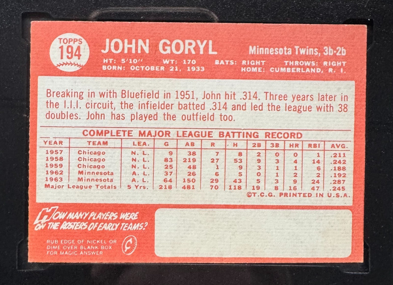 - 1964 Topps #194 John Goryl Minnesota Twins baseball card