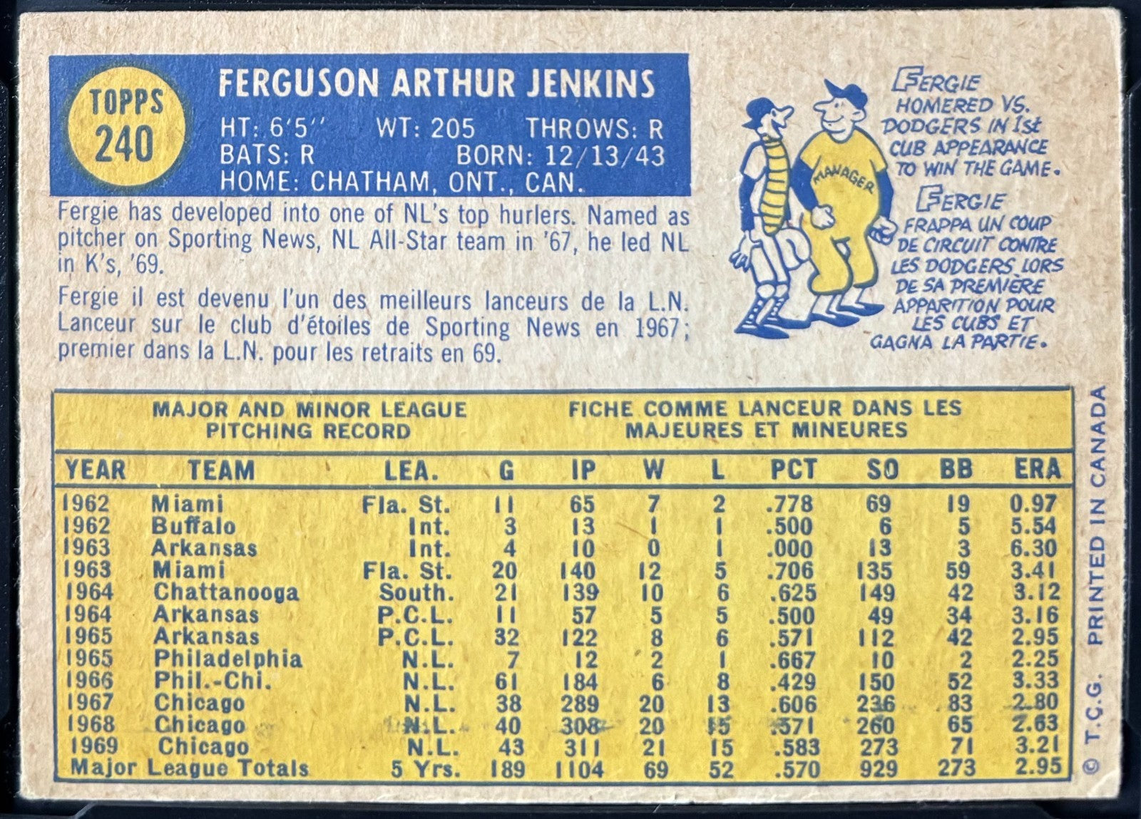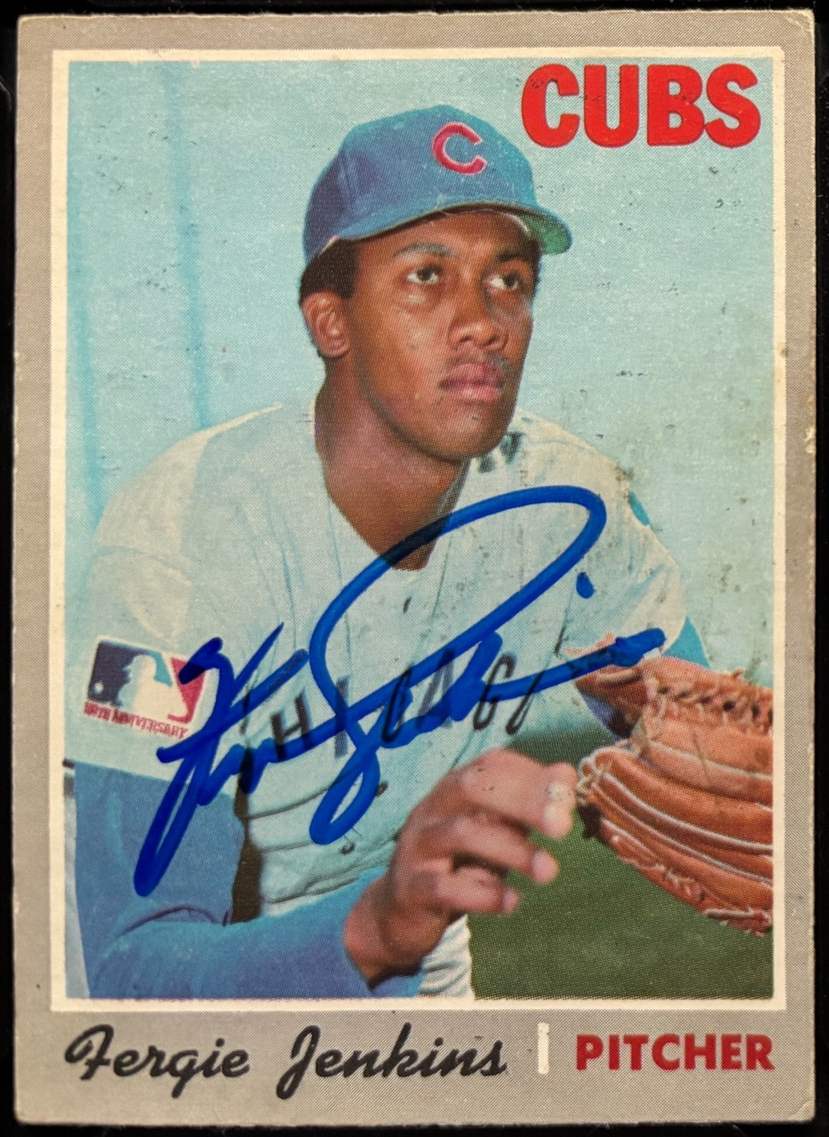 • 1970 O-Pee-Chee #240 Fergie Jenkins baseball card, hard-signed in blue marker by Jenkins