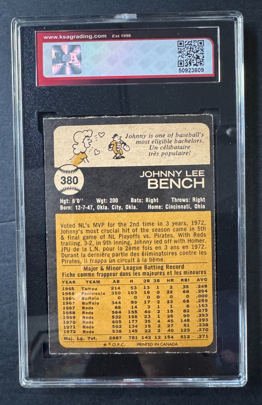 1973 O-PEE-CHEE #380 Johnny Bench Cincinnati Reds Baseball Card KSA 6 ENM MLB