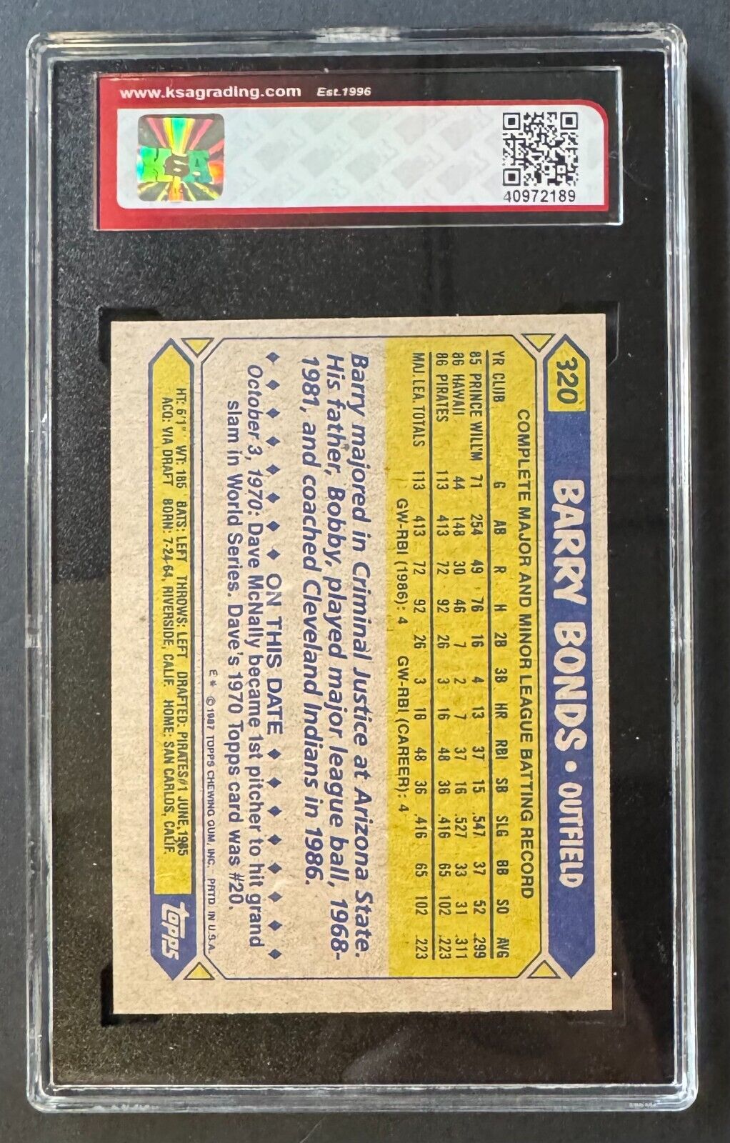 - 1987 Topps MLB #320 Barry Bonds Pittsburgh Pirates baseball rookie card