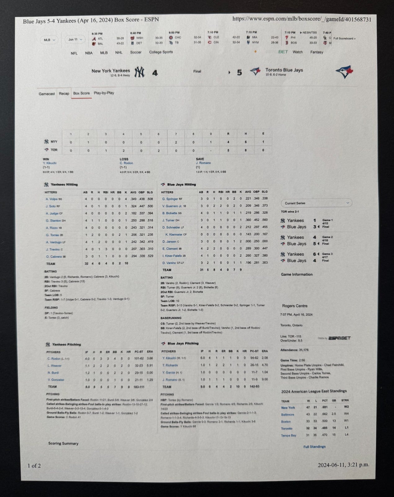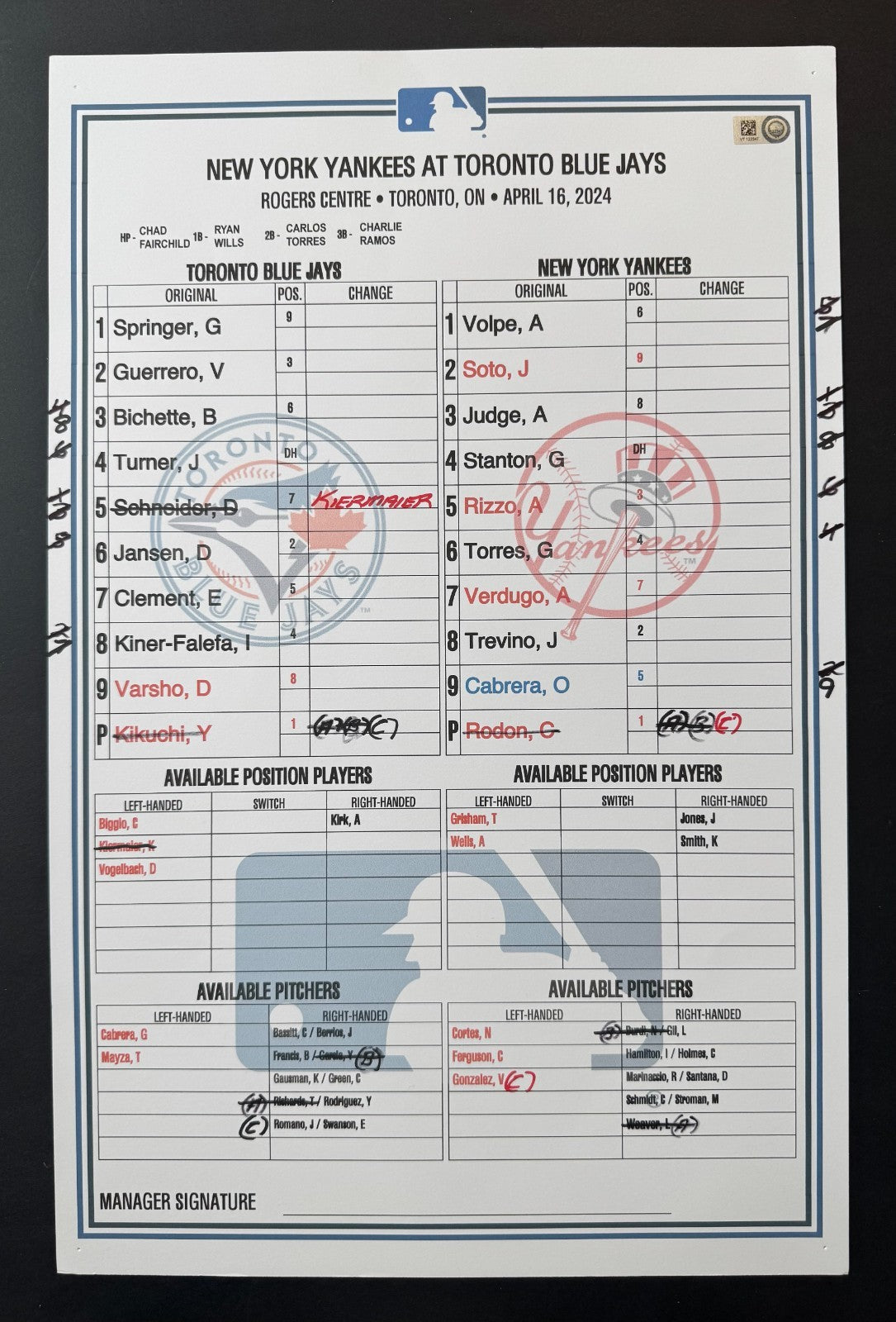 - Game-used lineup card from the April 16th, 2024 New York Yankees and Toronto Blue Jays game from the Blue Jays dugout