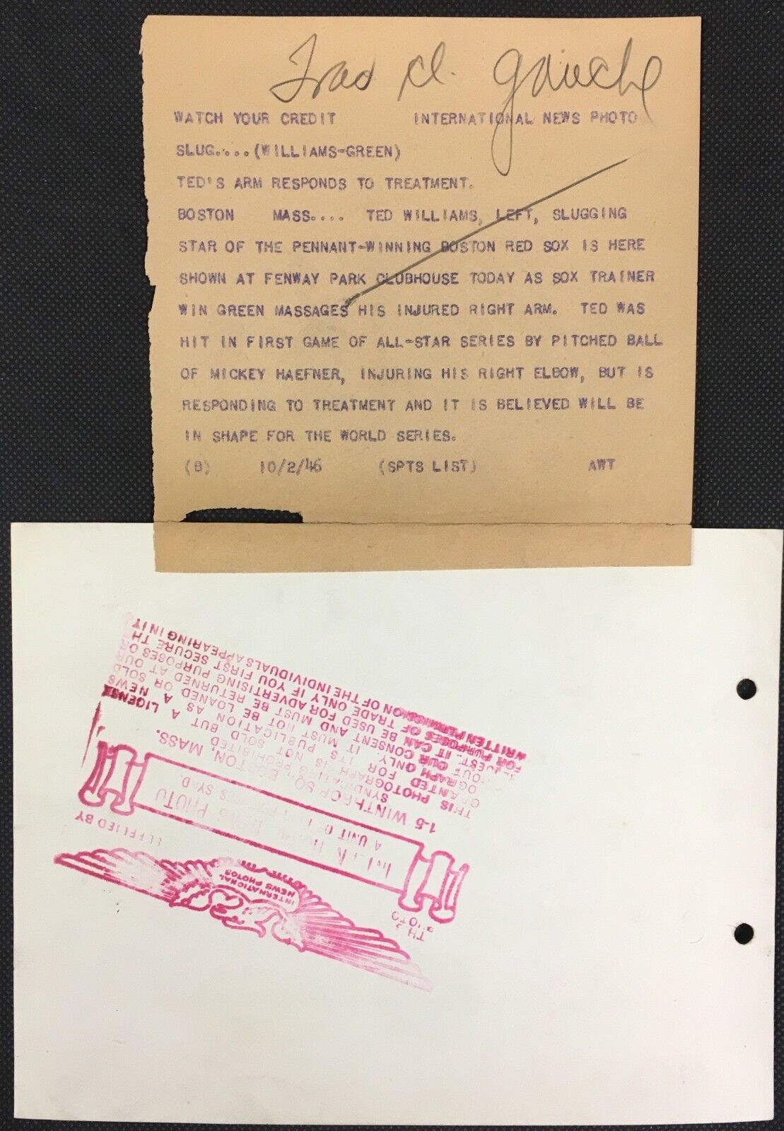 - 1946 Type 1 press photo, Ted Williams receiving treatment following an injury in the World Series