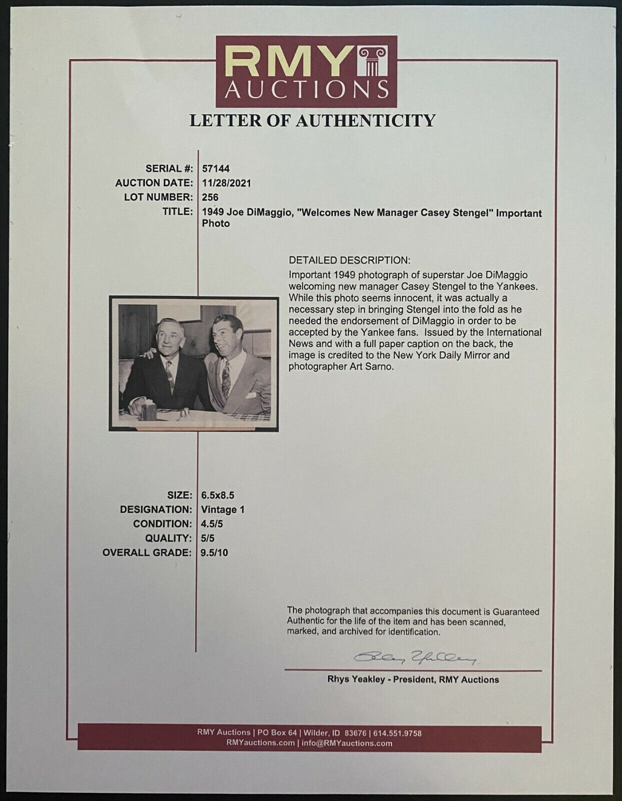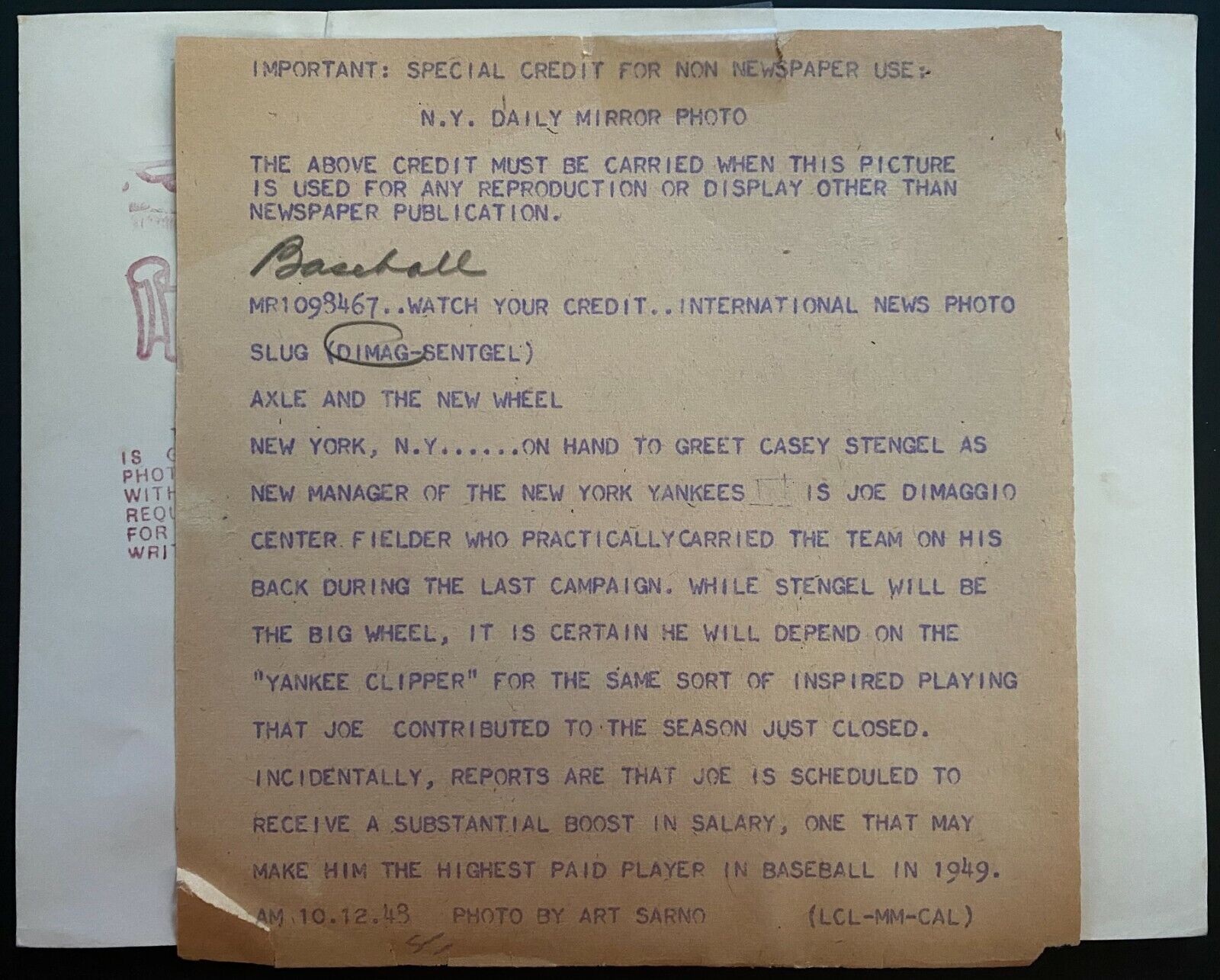 - 1949 Type 1 Press Photo of Yankee Joe DiMaggio welcoming New Manager Casey Stengel