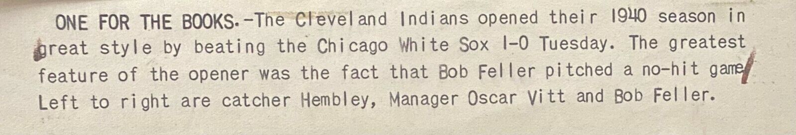• Photo taken after Cleveland Indians pitcher Feller threw a no hitter on openning day April 16 1940 to defeat Chicago White Sox 1-0
