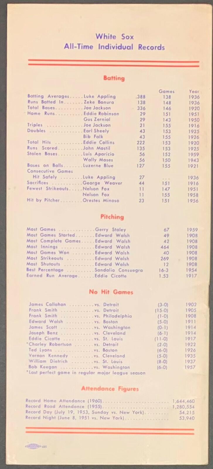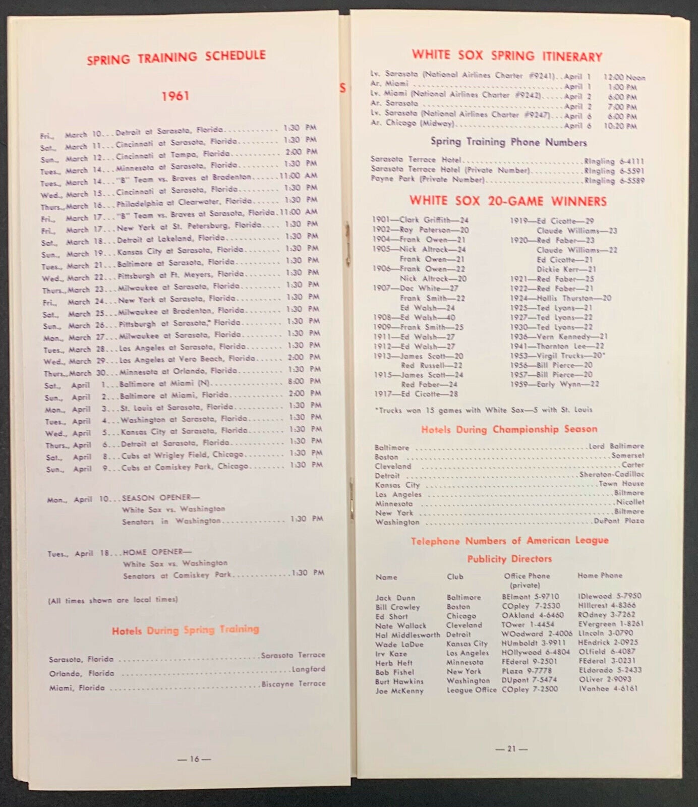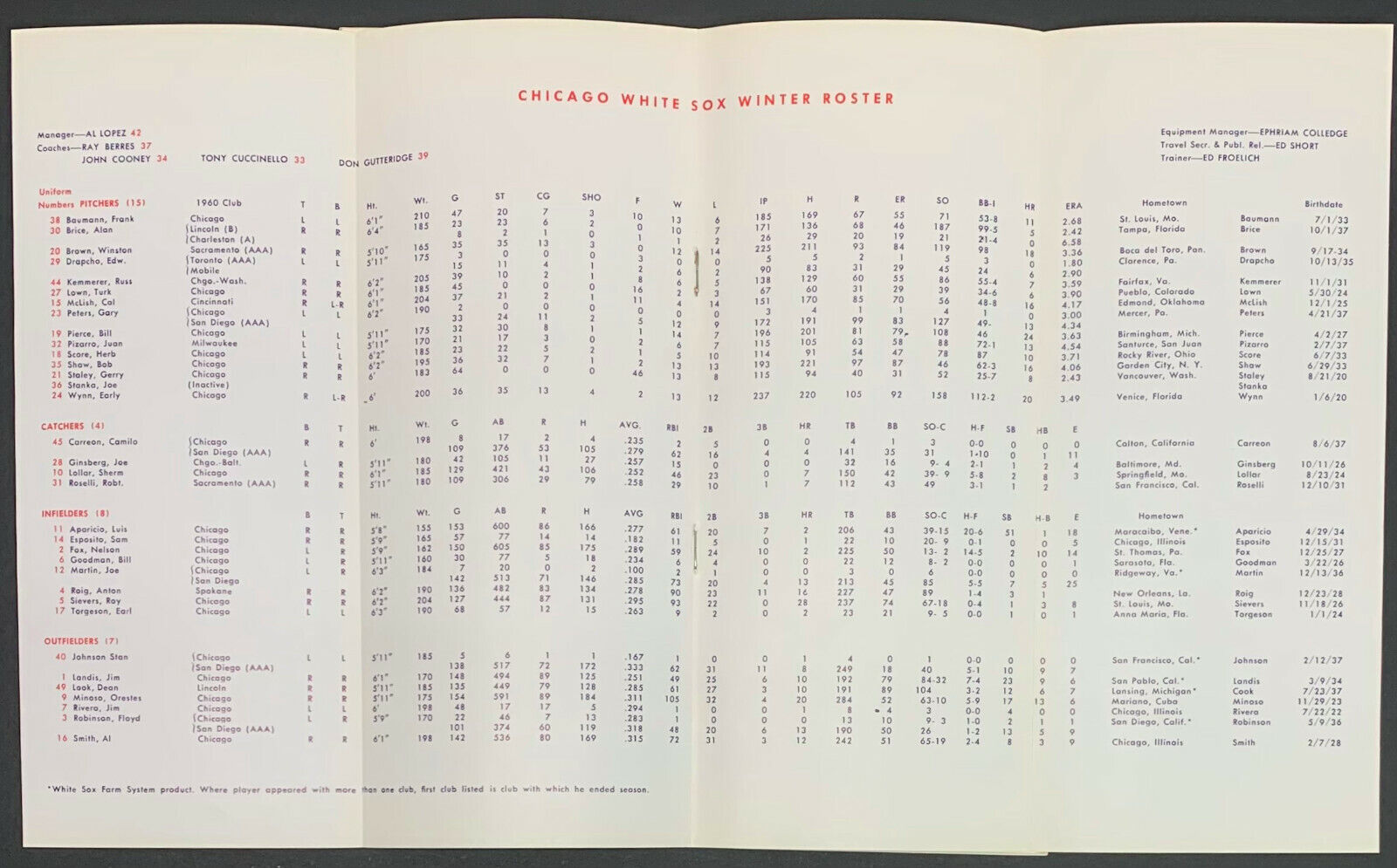 - 1961 Chicago White Sox Spring Training Roster / Press / Radio TV Media Guide