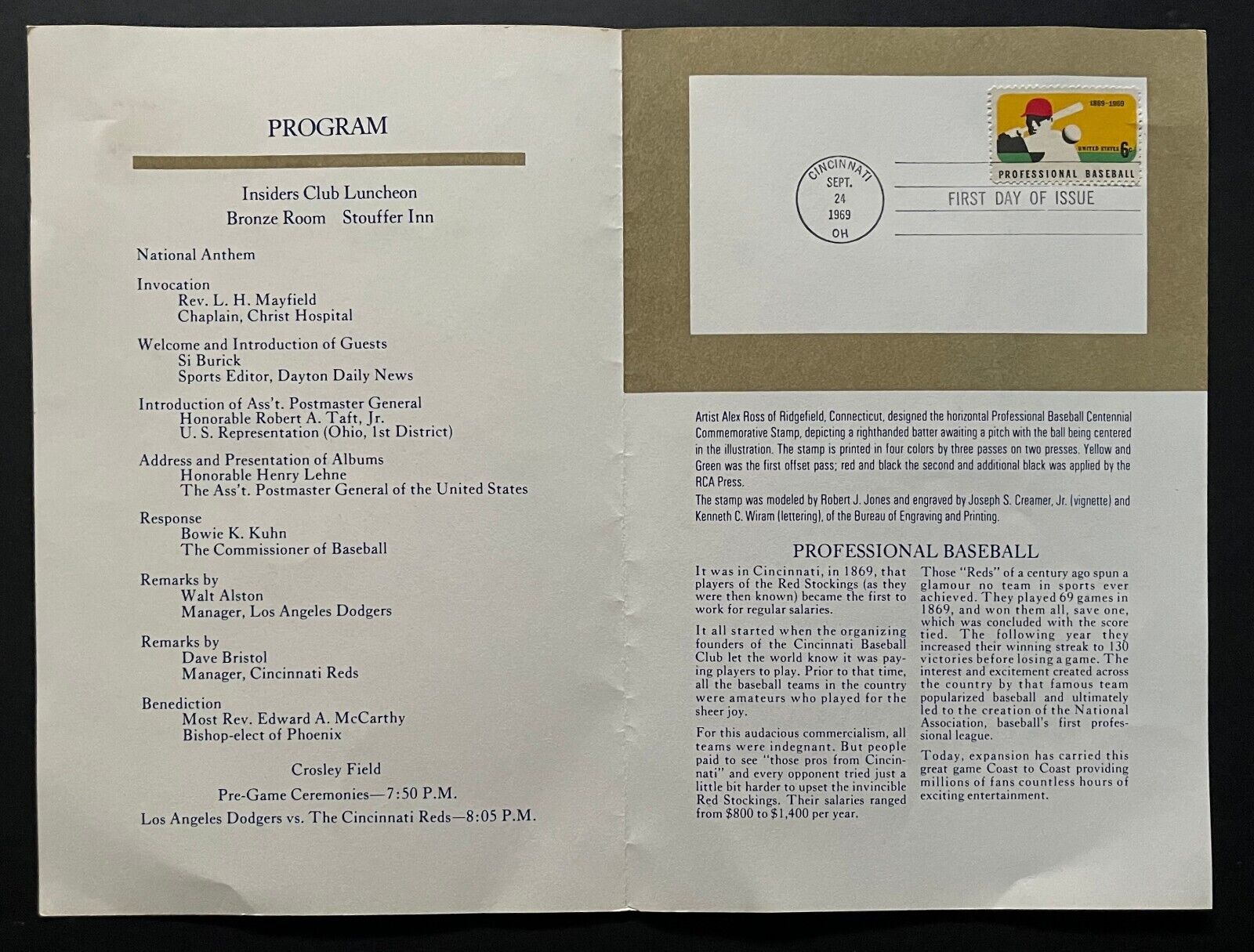 - Centennial of Baseball September 24th, 1969 luncheon program at Cincinnati to celebrate 100 years of pro baseball + honoured with US Postal Service issuing a Centennial of Baseball stamp . Stamp is included in the program with a first day of issue cancellation . Luncheon is followed by Dodgers vs Cincinnati Reds game at Crosley Field