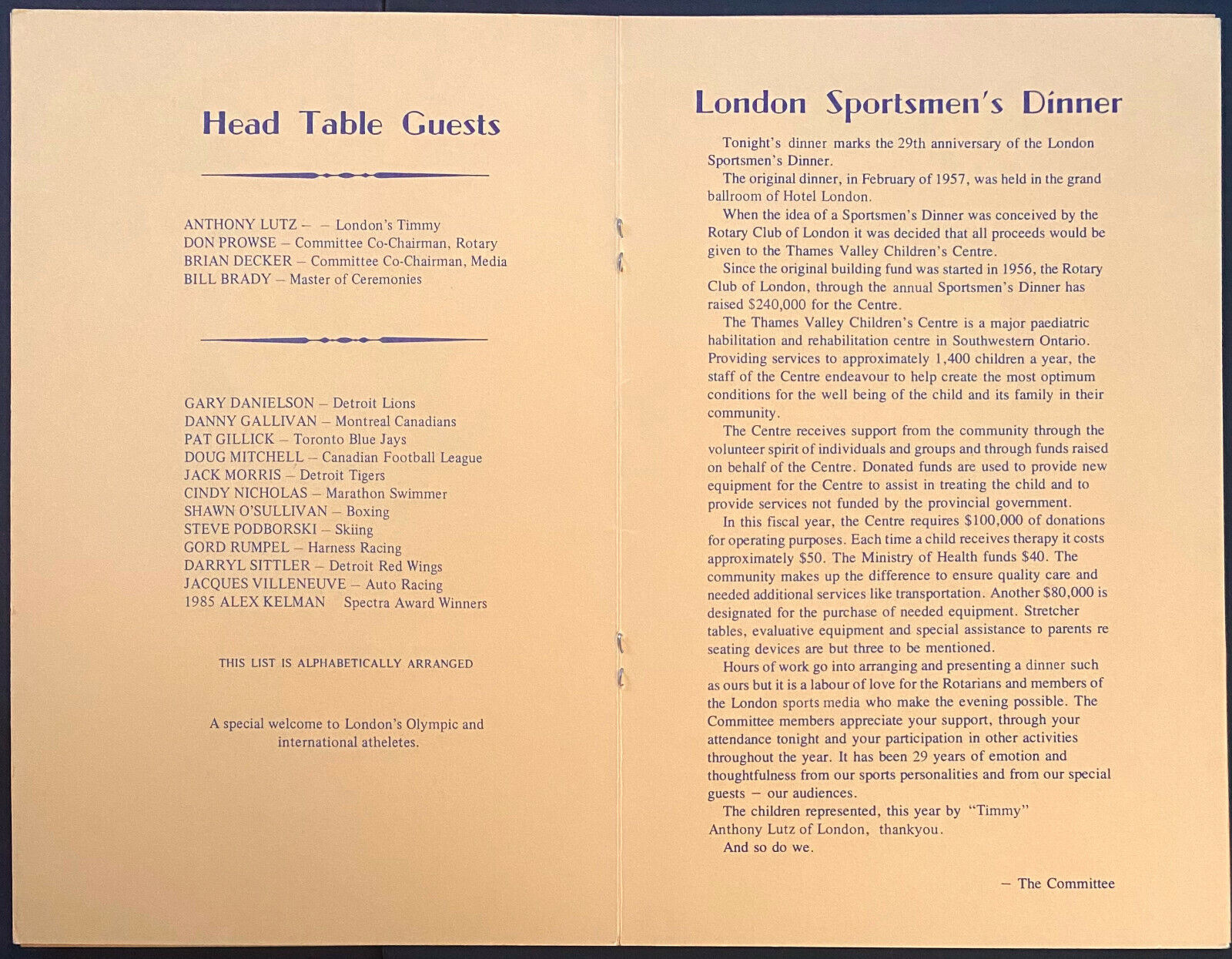 - Danny Gallivan + Tiger Williams Signed 1985 London, Ontario Sports Celebrity Dinner Program