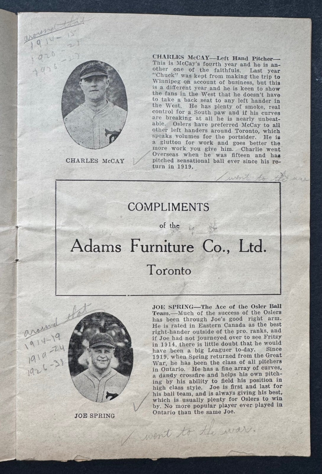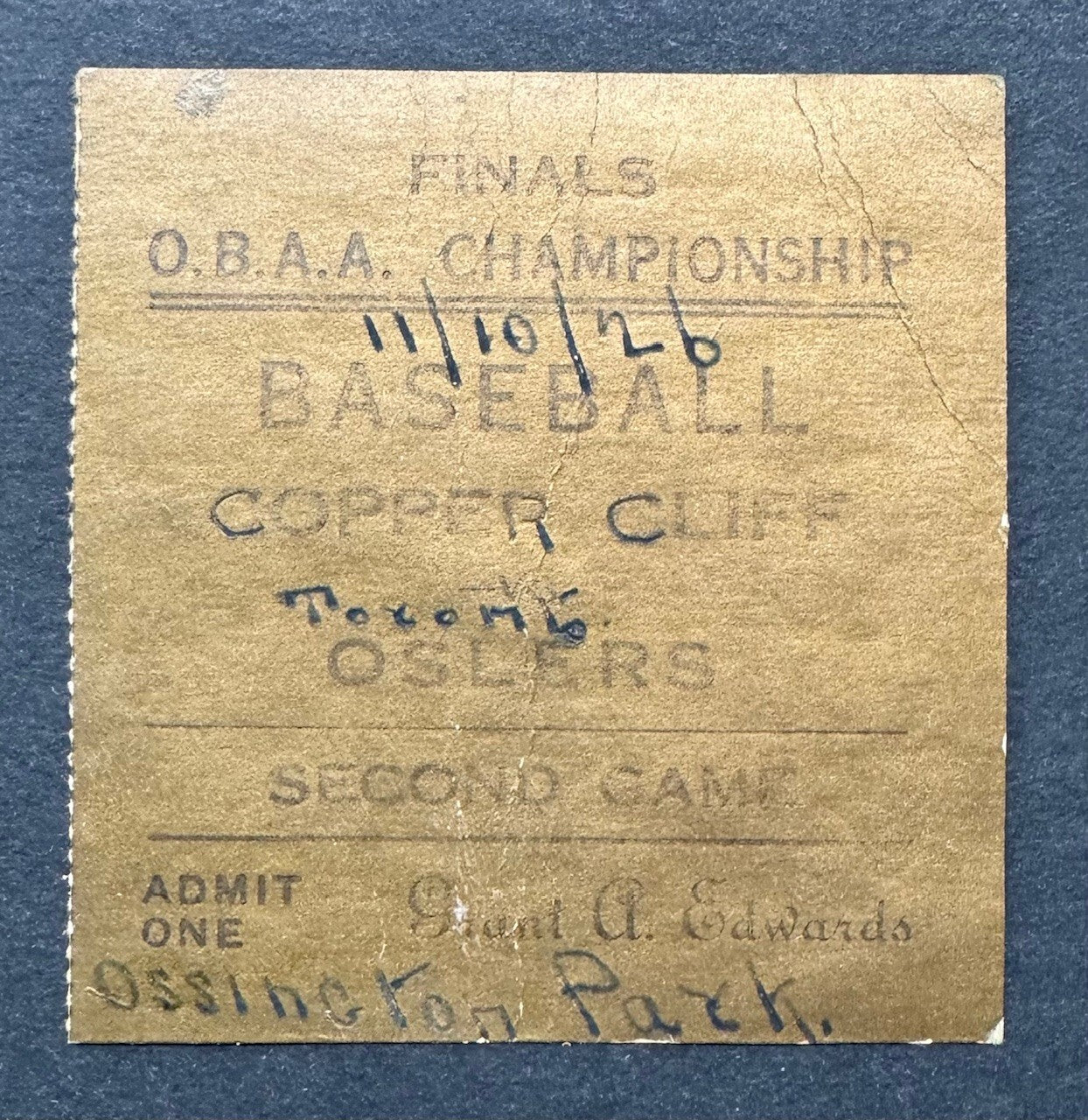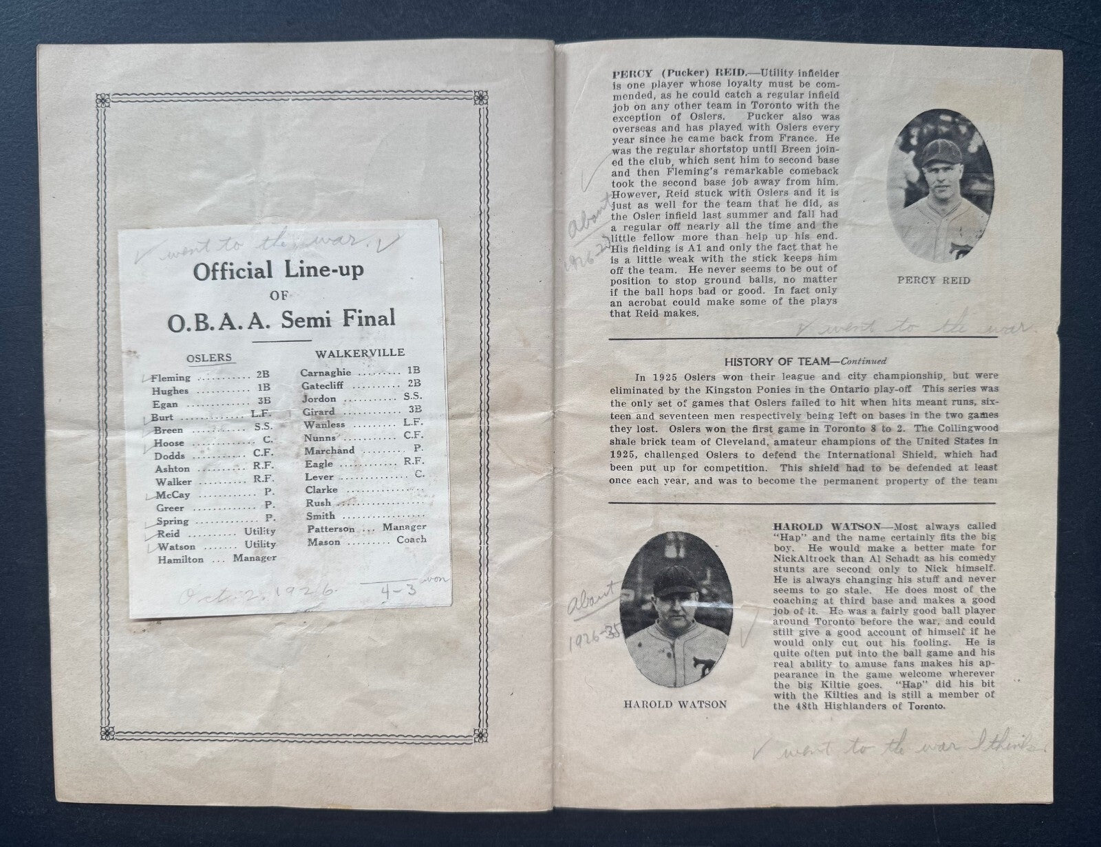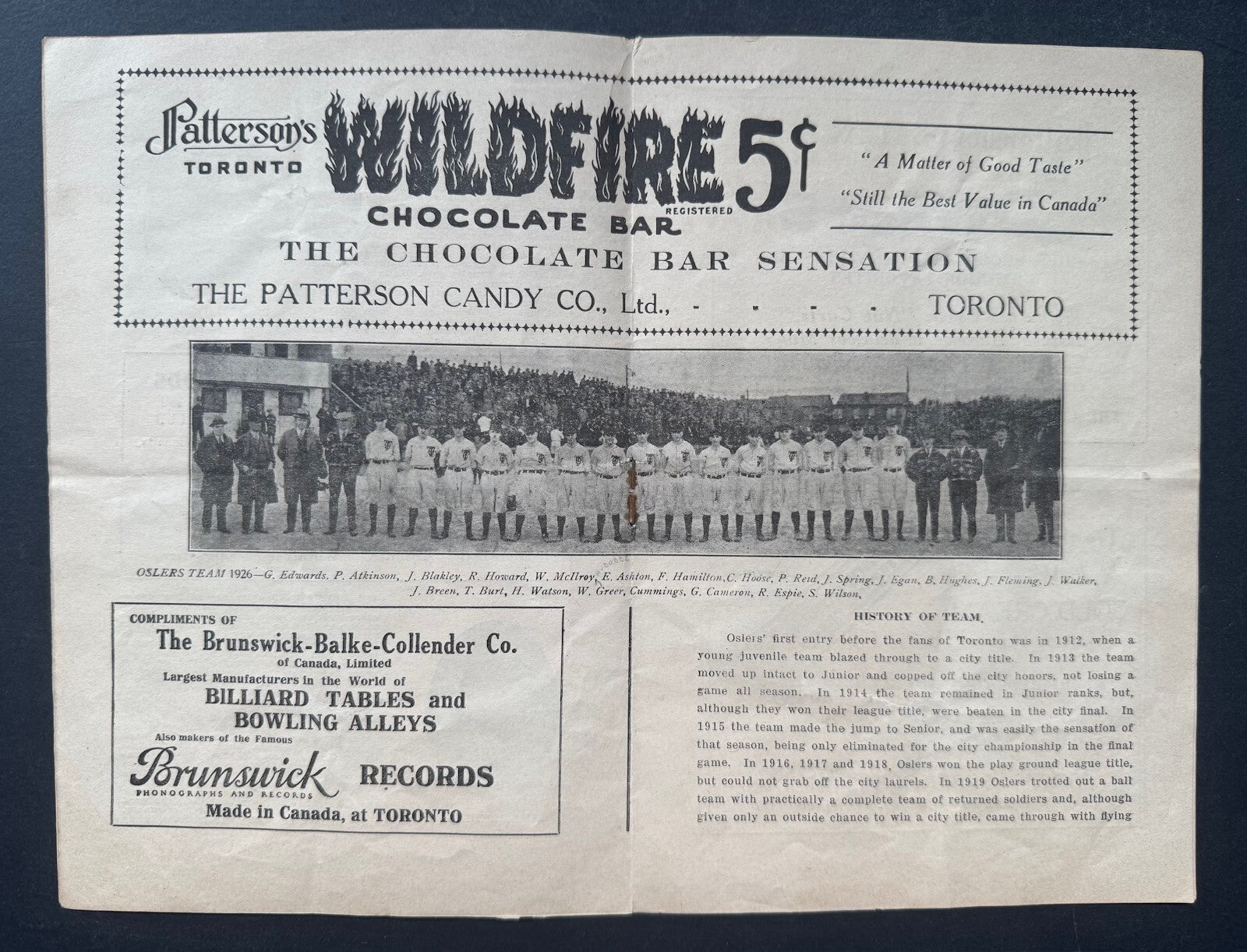 - Package includes Oct. 2, 1926 program with lineup inside. Toronto wins 4-3 and advance to finals where they defeat Copper Cliff on Oct. 10. Ticket from final included for game at Ossington Park Lineup for quarterfinal game also included (glued beneath semi final lineup). Also included 3 news clipping recapping playoffs and bio of player Jimmy Fleming. Two Dominion chocolate player cards of Joe Spring and Joe Breen