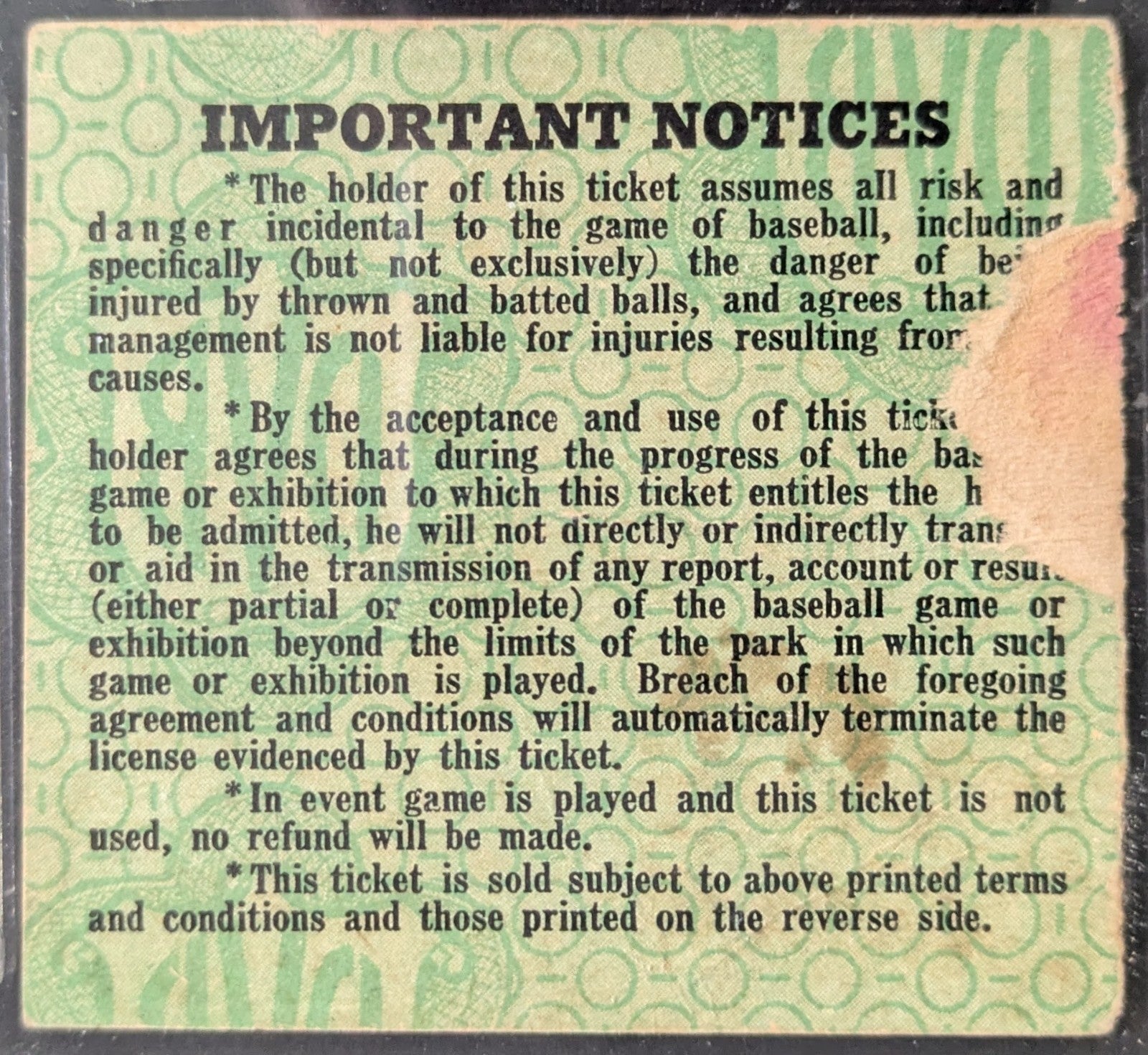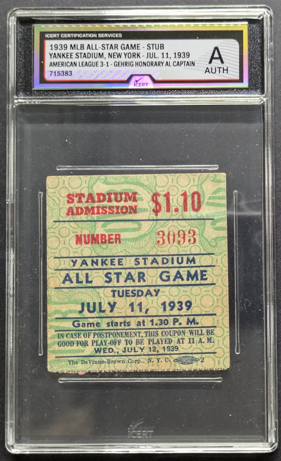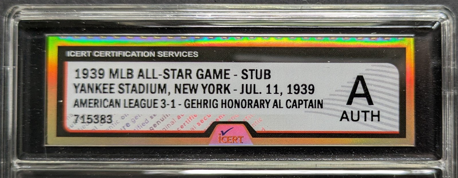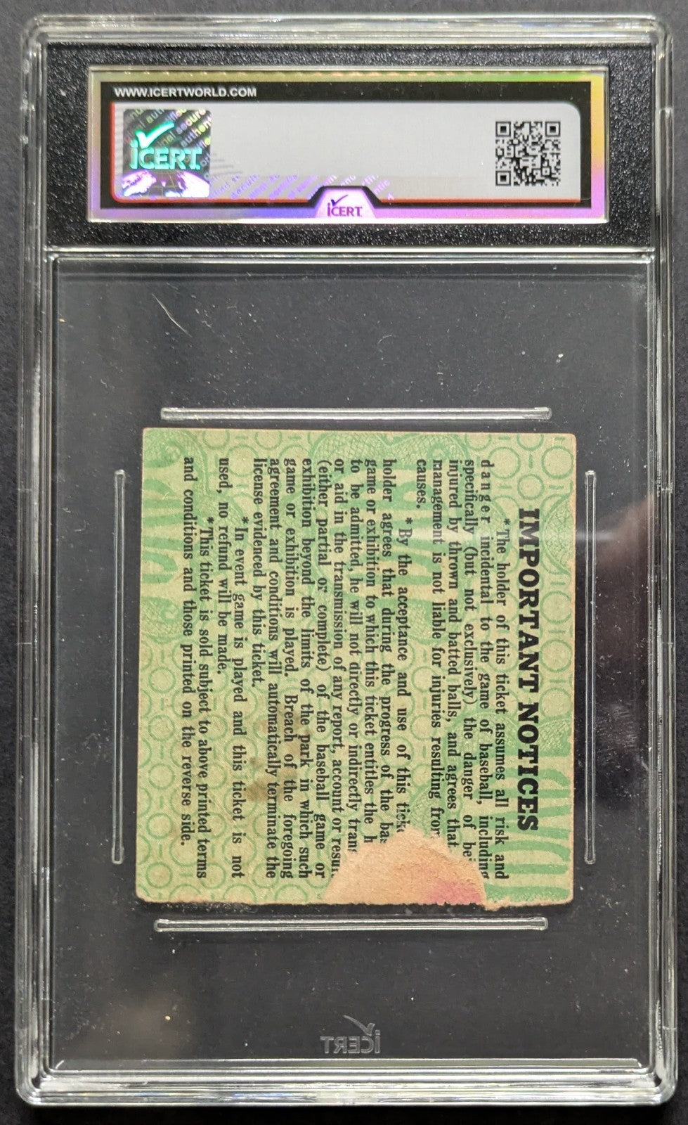- Graded/slabbed iCert A Auth. Some slight material loss on back of ticket, corner and edge wear