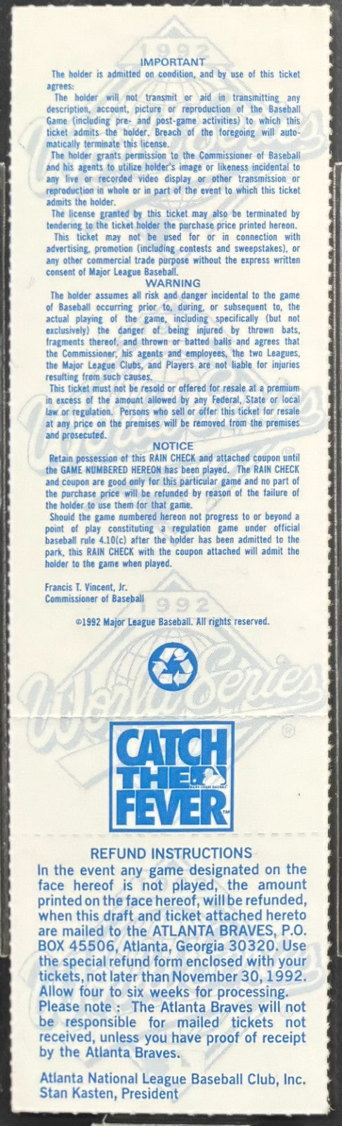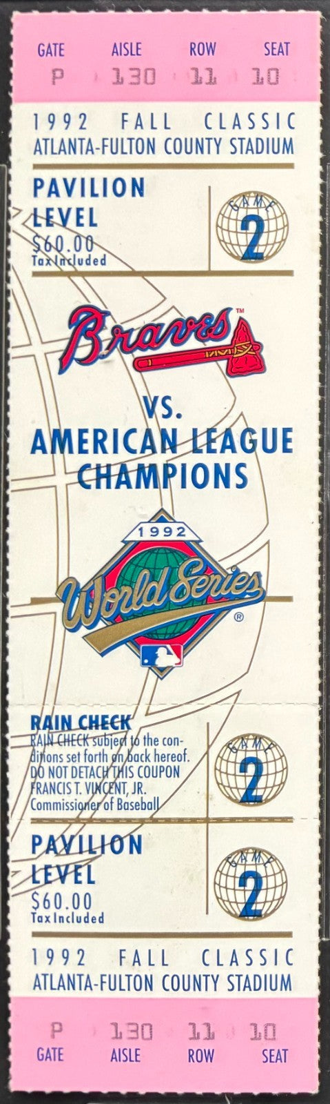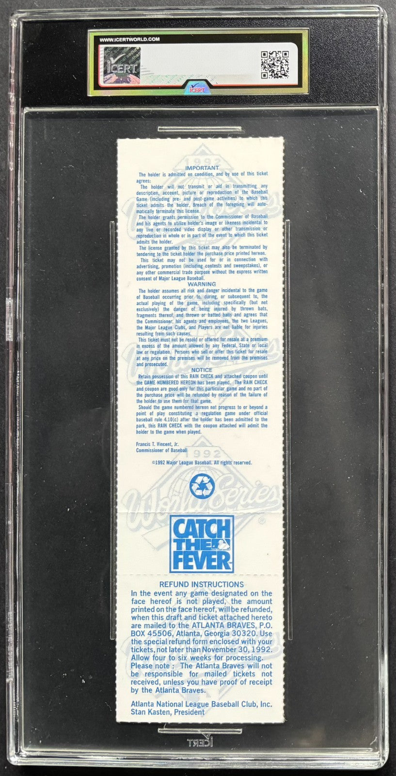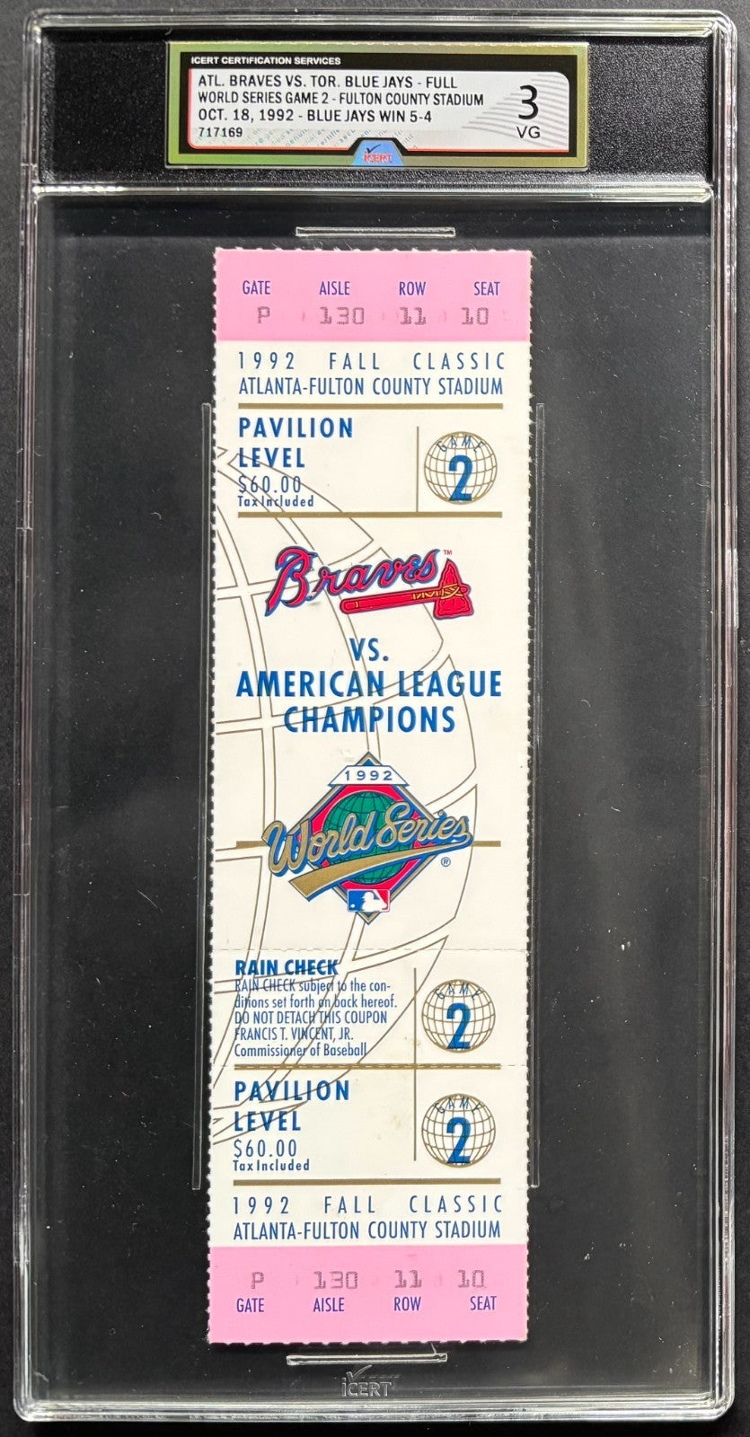 1992 World Series Game 2 Full Ticket iCert 3 VG Toronto Blue Jays Atlanta Braves