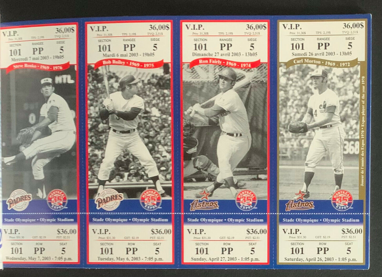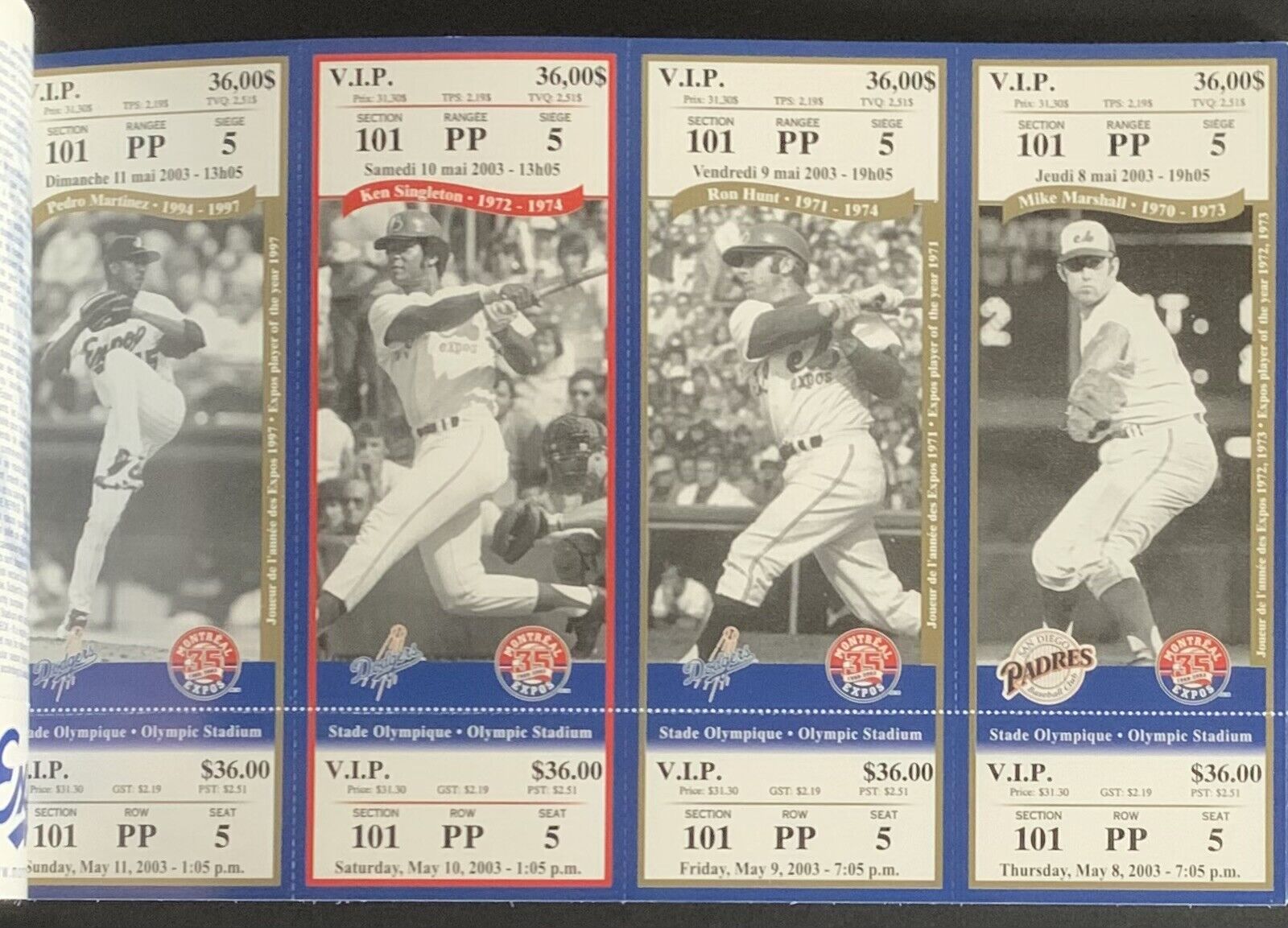 - 2003 full book of Montreal Expos season tickets - the book has only 59 tickets for games played in Montreal. Expos played 22 of their games in Puerto Rico during 2003 season. All 59 tickets have photos of former Expo star players