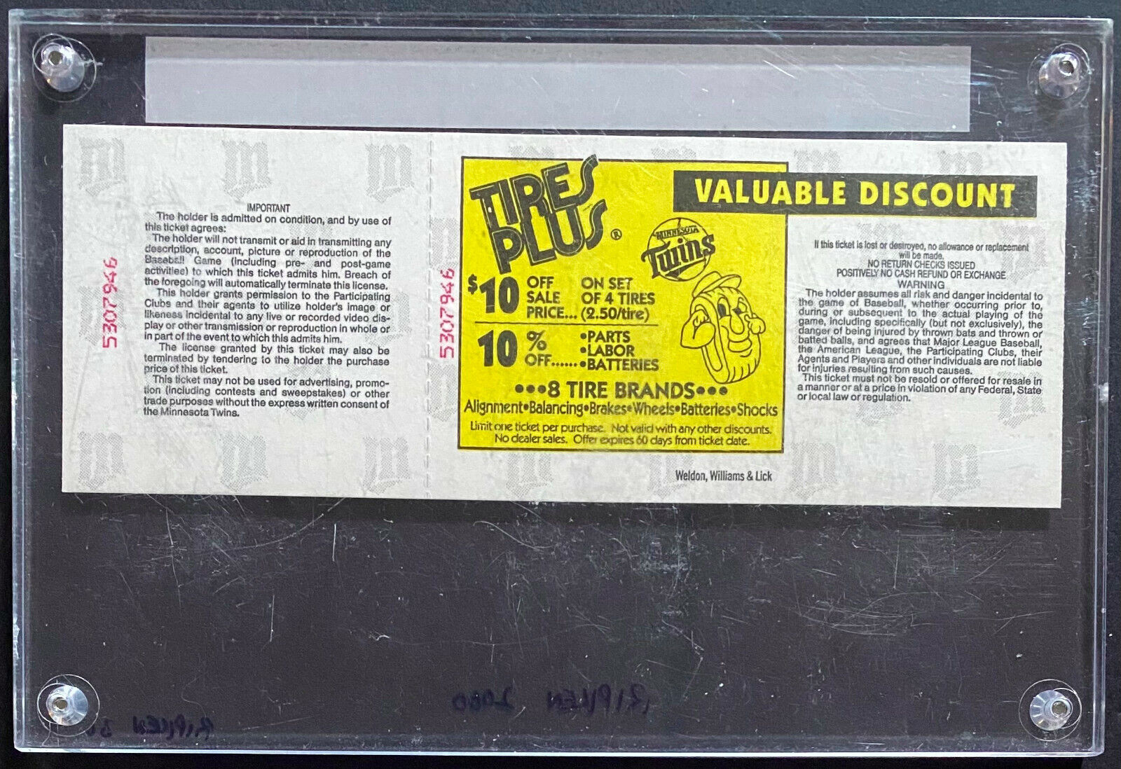 - August 1994 Minnesota Twins vs Baltimore Orioles unused full ticket