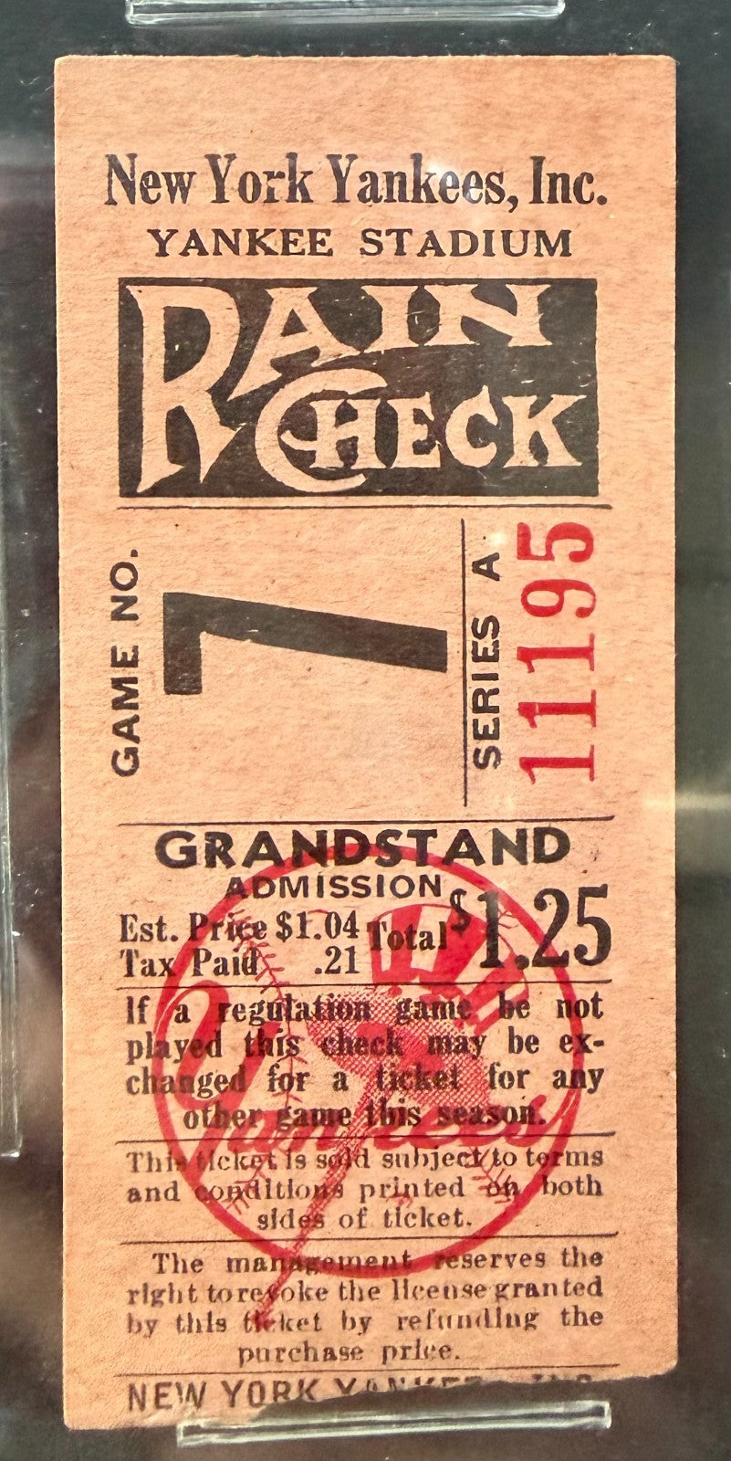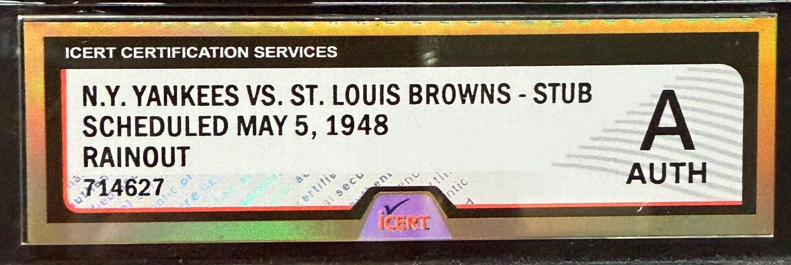 - New York Yankees vs St. Louis Browns MLB ticket stub for a game originally scheduled for May 5th, 1948 at Yankee Stadium in the Bronx