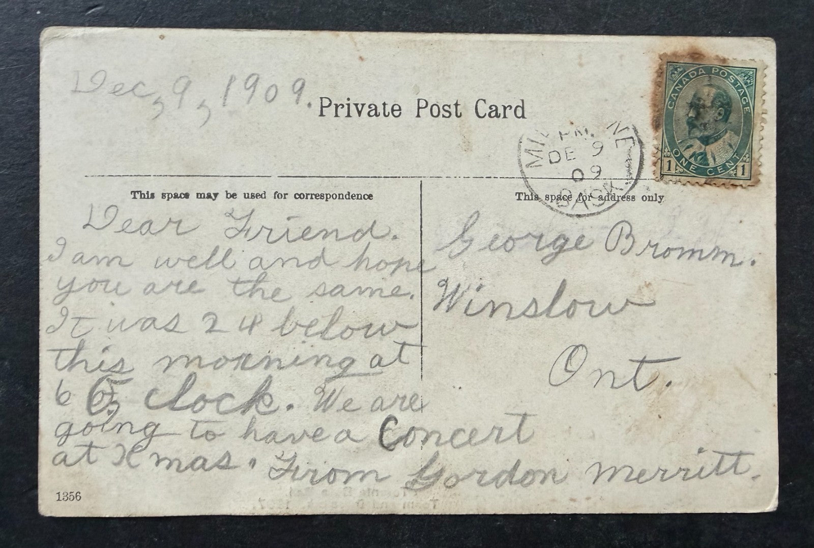 - Very good condition; edges are clean. Some very minor corner wear. Some faint spots of brown discoloration on front of postcard. Image displays very well. Reverse also displays some dark discoloration most notably around the stamp. Back of postcard displays some pencil writing and is stamped ‘09