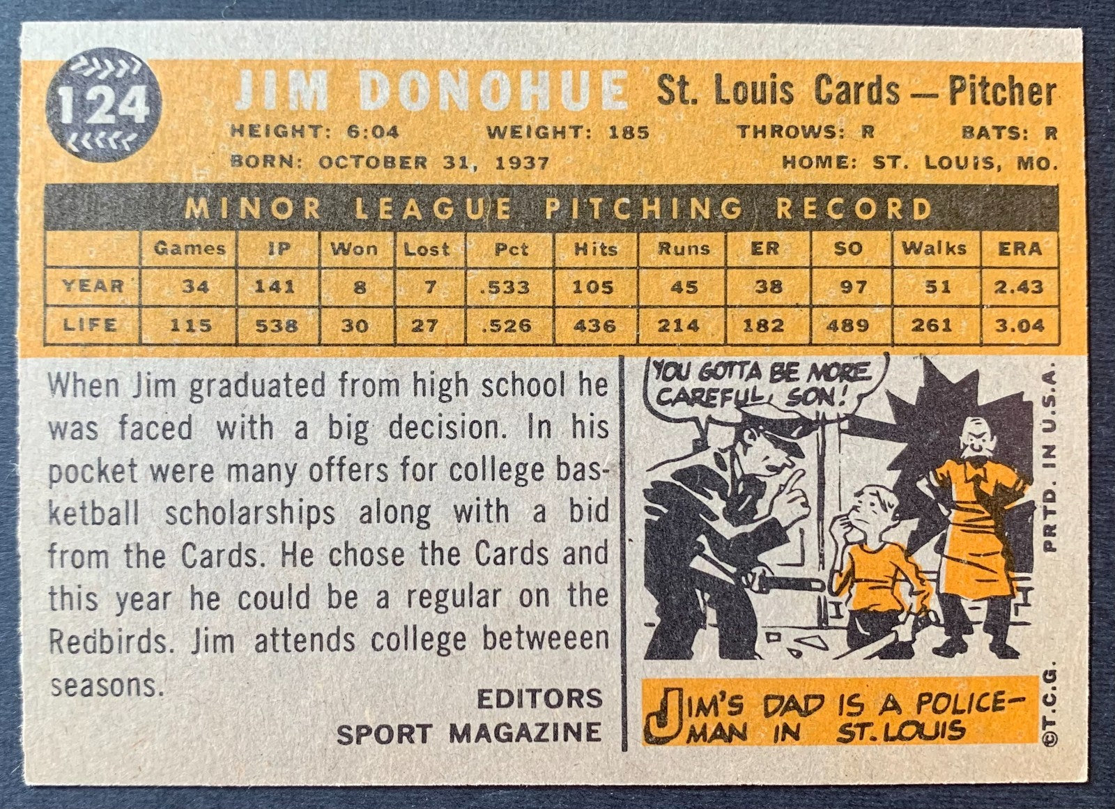 • 1960 Topps #124 Jim Donohue St. Louis Cardinals Baseball Card MLB Pitcher Rookie