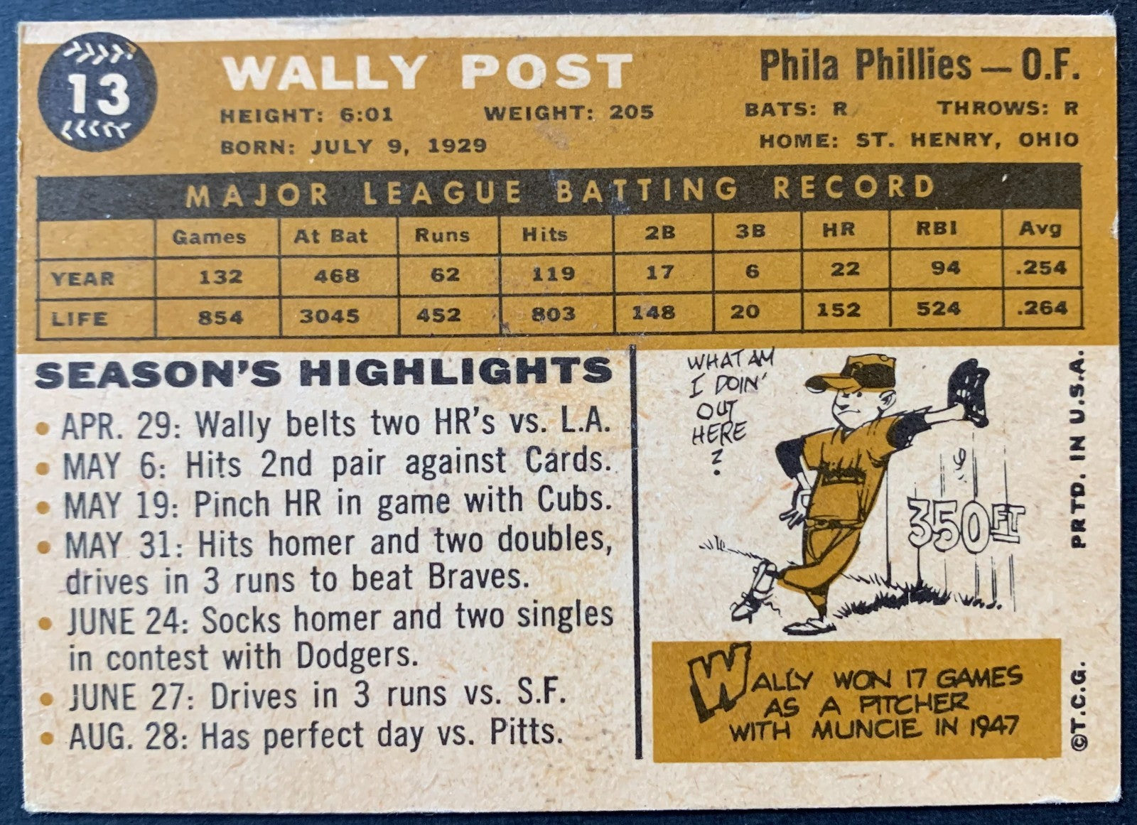 - 1960 Topps #13 Wally Post Philadelphia Phillies Baseball Card MLB Outfielder
