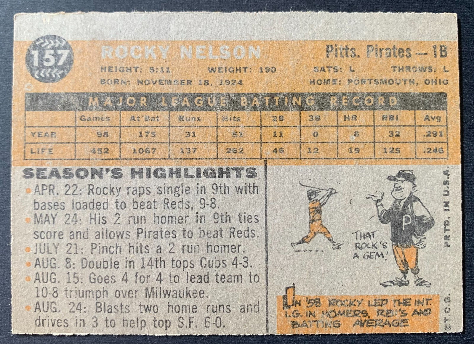 1960 Topps #157 Rocky Nelson Pittsburgh Pirates Baseball Card MLB Infielder