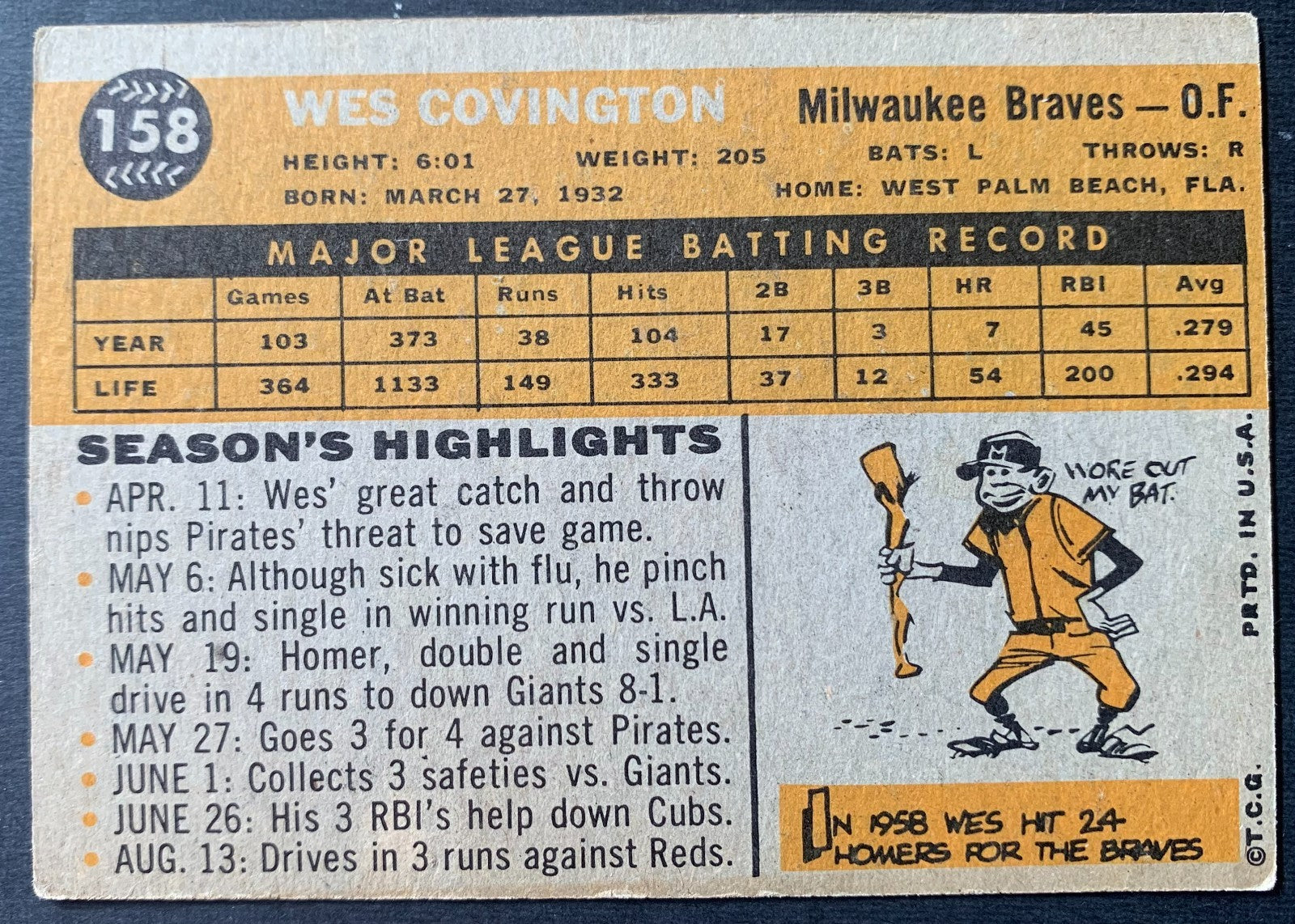 • 1960 Topps #158 Wes Covington Milwaukee Braves Baseball Card MLB Outfielder