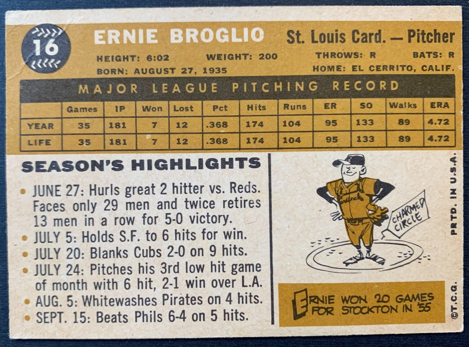 - 1960 Topps #16 Ernie Broglio St. Louis Cardinals Baseball Card MLB Pitcher