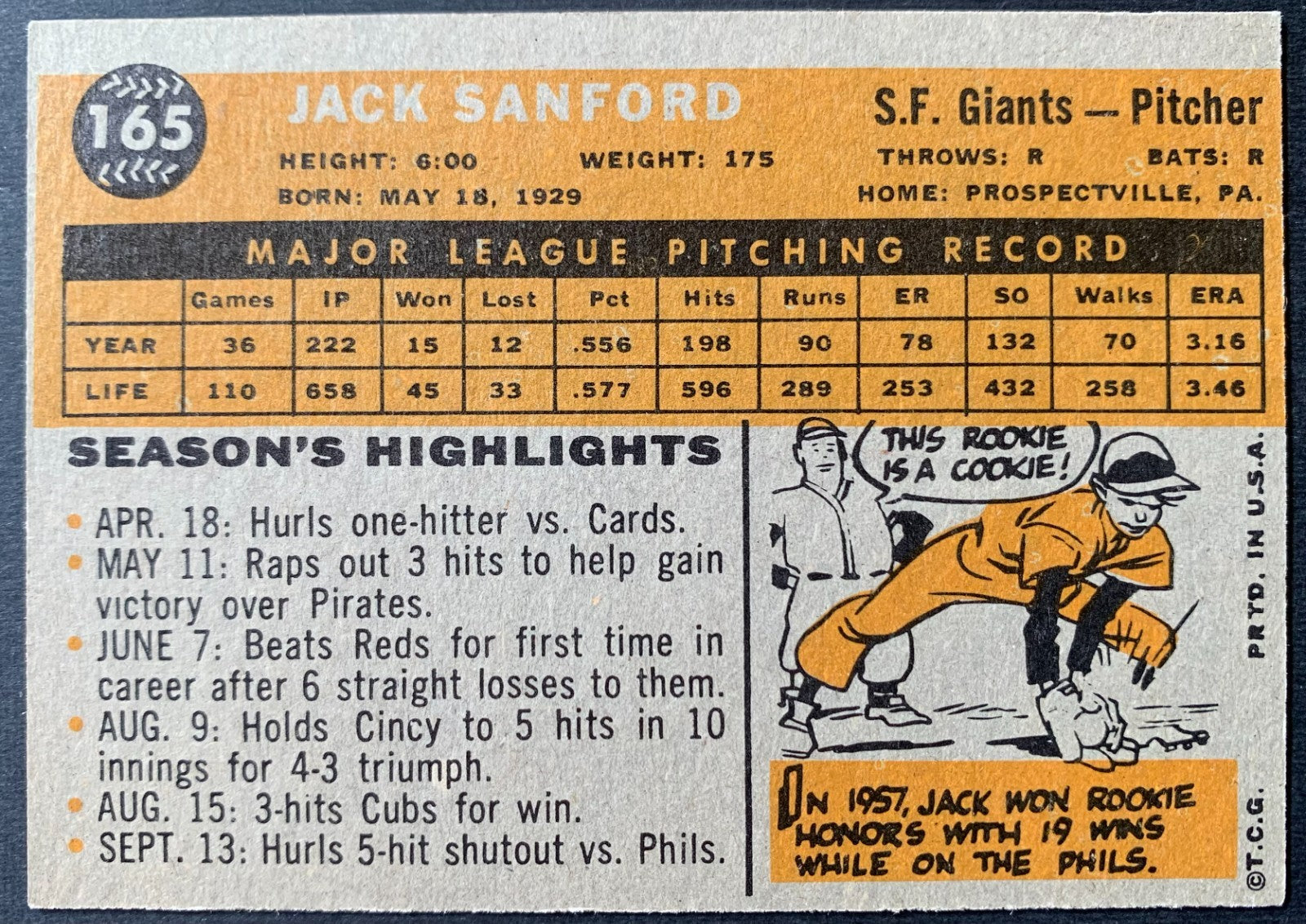 1960 Topps #165 Jack Sanford San Francisco Giants Baseball Card MLB Pitcher