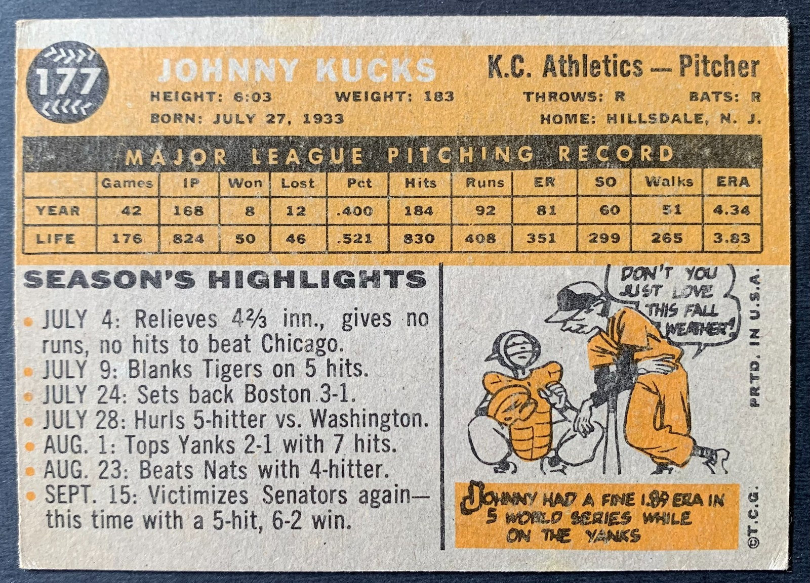- 1960 Topps#177 Johnny Kucks Kansas City Athletics Baseball Card MLB Pitcher