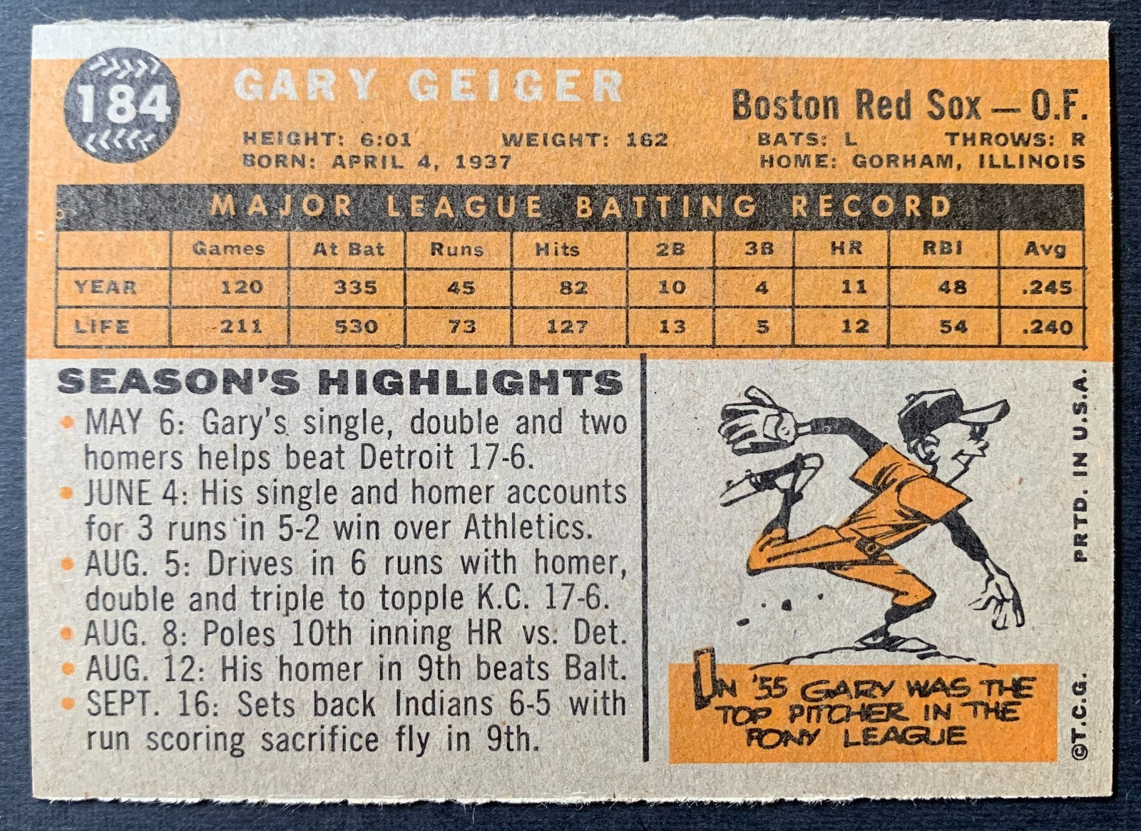 - 1960 Topps #184 Gary Geiger Boston Red Sox Baseball Card MLB Outfielder