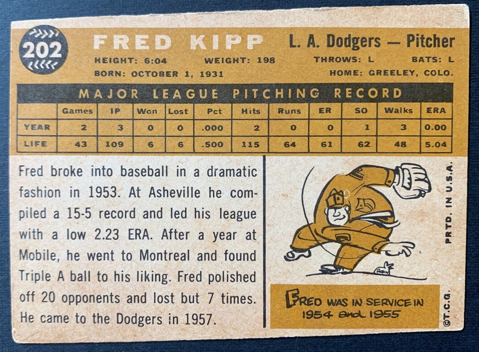 • 1960 Topps #202 Fred Kipp Los Angeles Dodgers Baseball Card MLB Pitcher