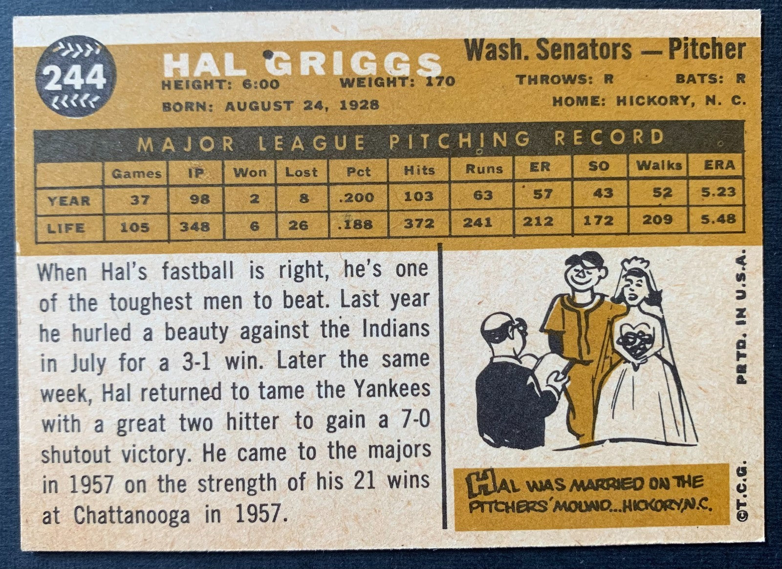 - 1960 Topps #244 Hal Griggs Washington Senators Baseball Card MLB Pitcher