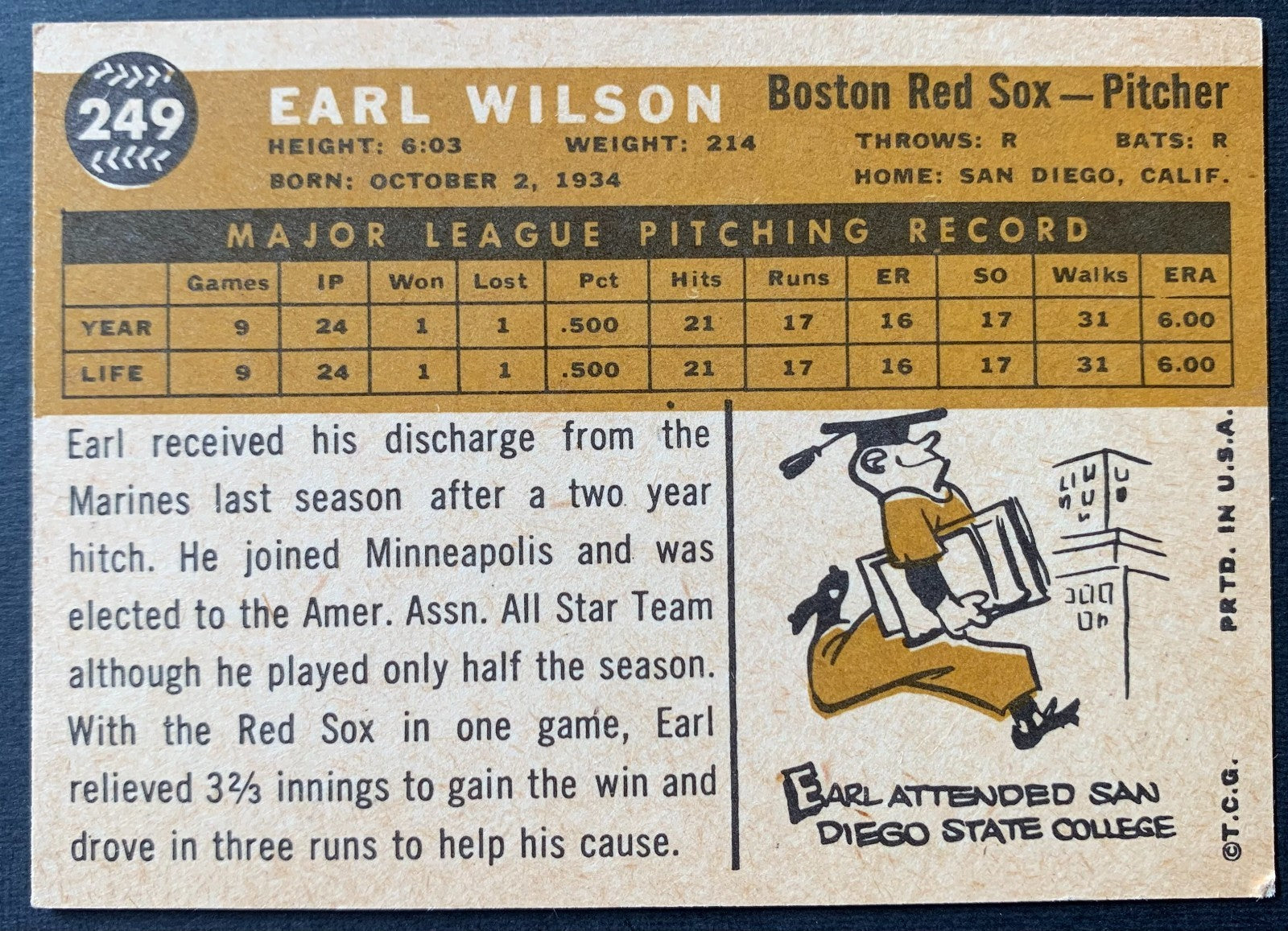 • 1960 Topps #249 Earl Wilson Boston Red Sox Baseball Card MLB Pitcher
