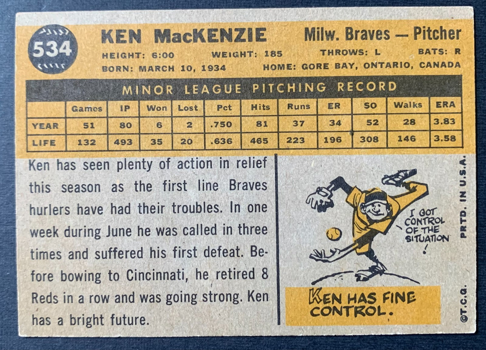 - 1960 Topps #534 Ken MacKenzie Milwaukee Braves Baseball Card MLB Pitcher