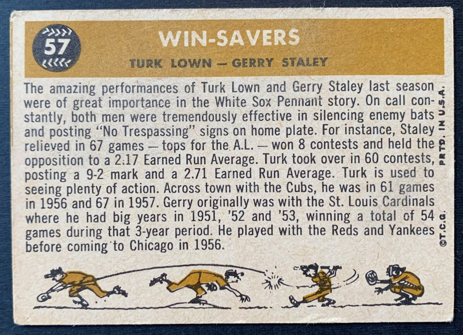 - 1960 Topps #57 Turk Lown + Gerry Staley Win Savers Baseball Card MLB White Sox
