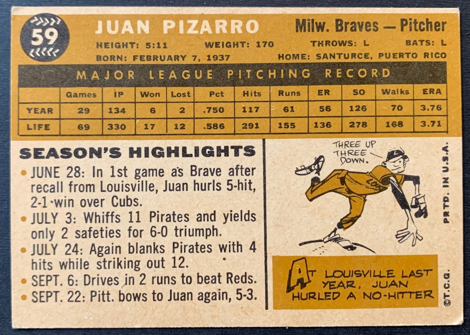 • 1960 Topps #59 Juan Pizarro Milwaukee Braves Baseball Card MLB Pitcher