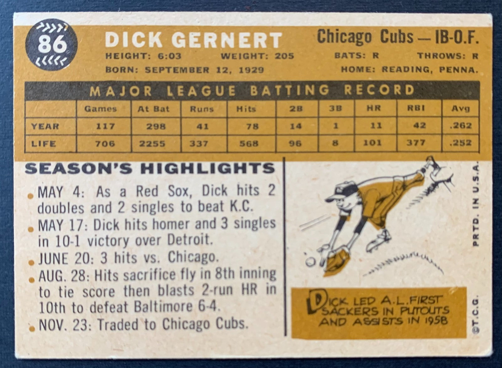 - 1960 Topps #86 Dick Gernert Chicgo Cubs Baseball Card MLB Outfielder