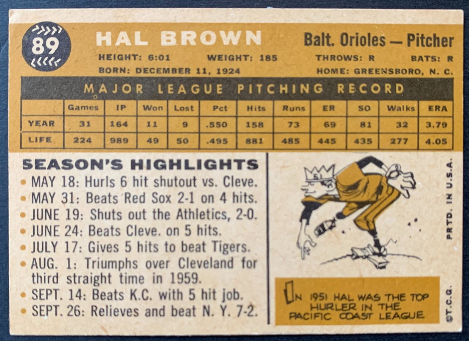 - 1960 Topps #89 Hal Brown Baltimore Orioles Baseball Card MLB Pitcher