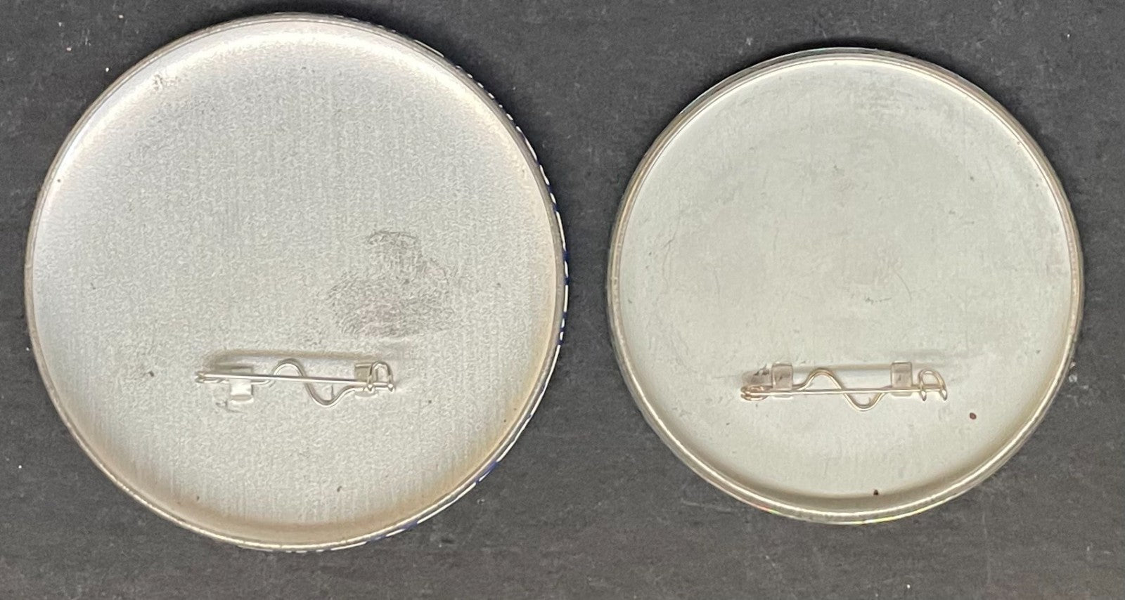 - Dimensions: Small pinback 3" diameter - Large Pinback 3.5" diameter