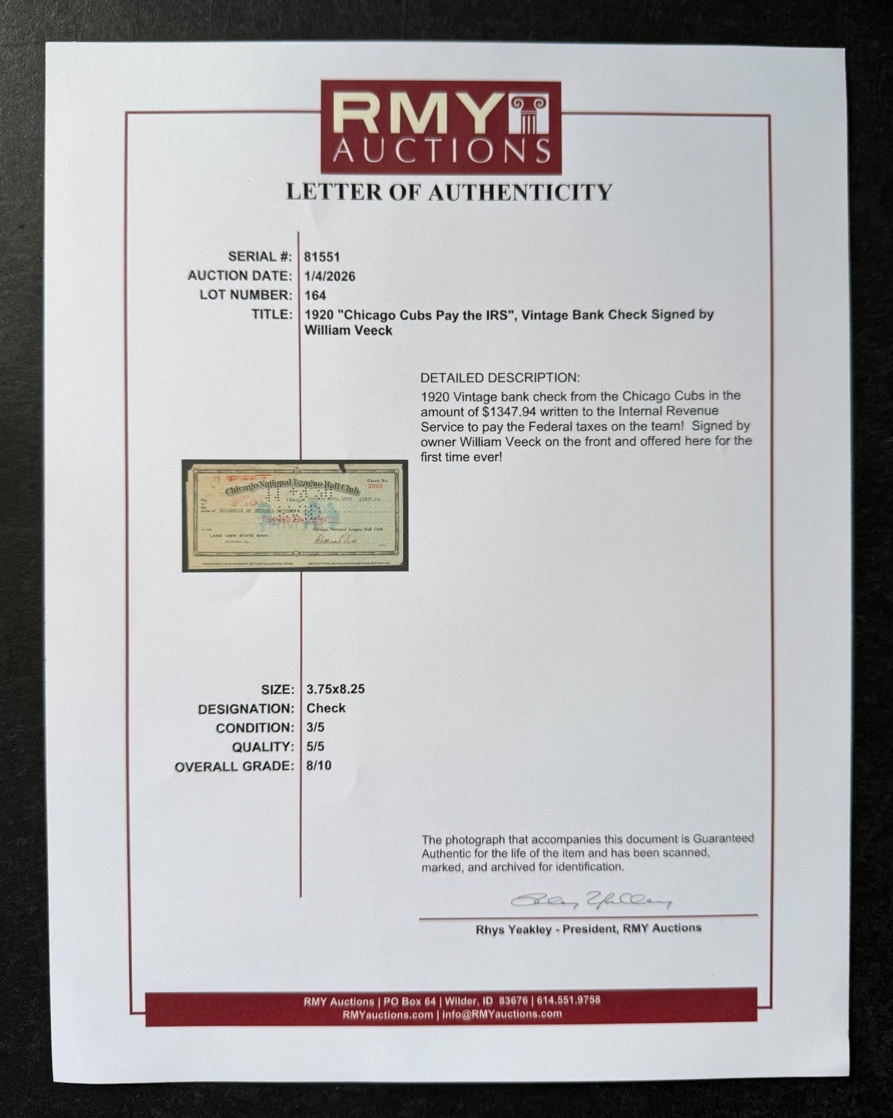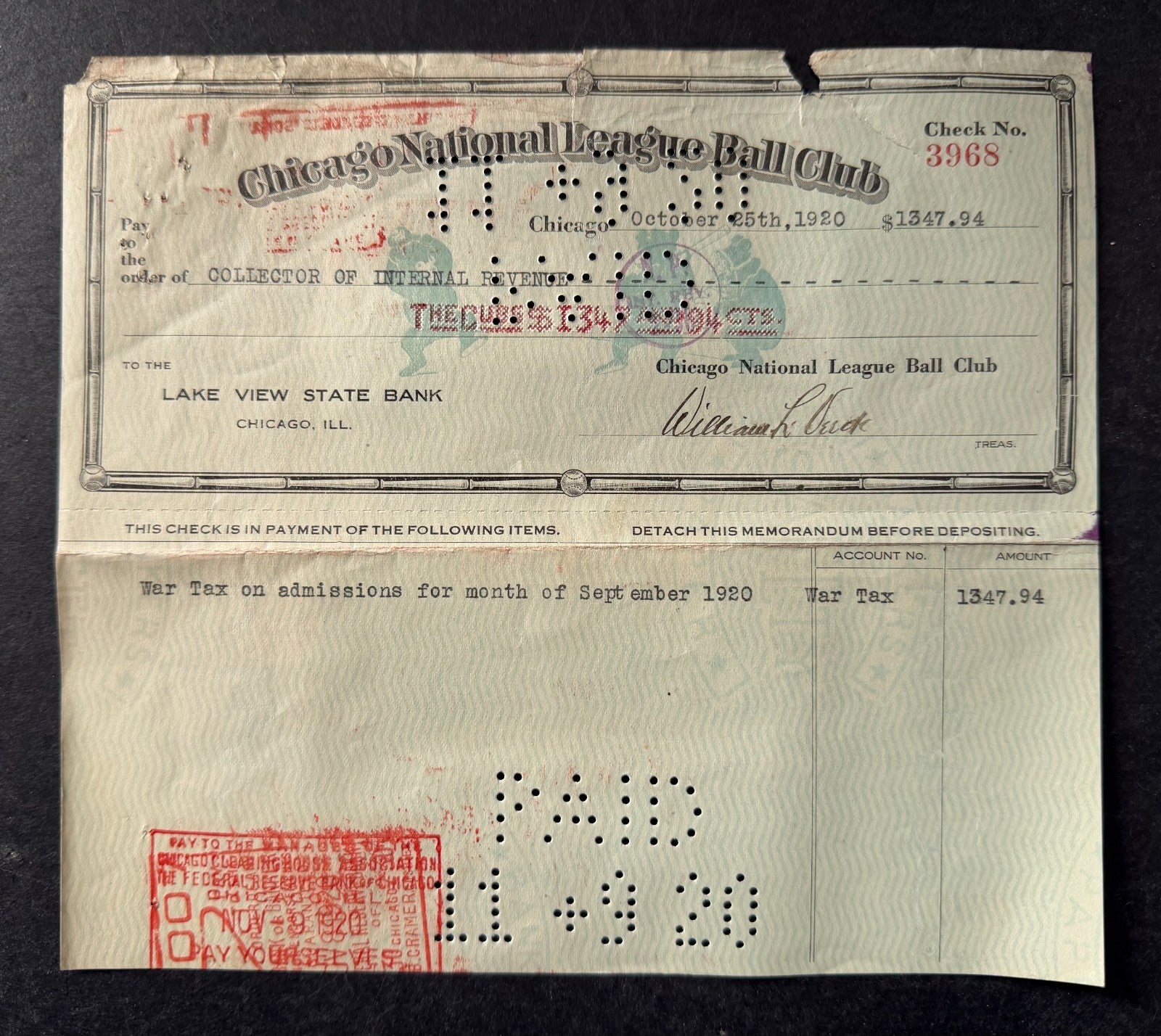 - William was president of the Chicago Cubs from 1919-1933. Oct. 25, 1920 signed cheque/check with attached remittance advice