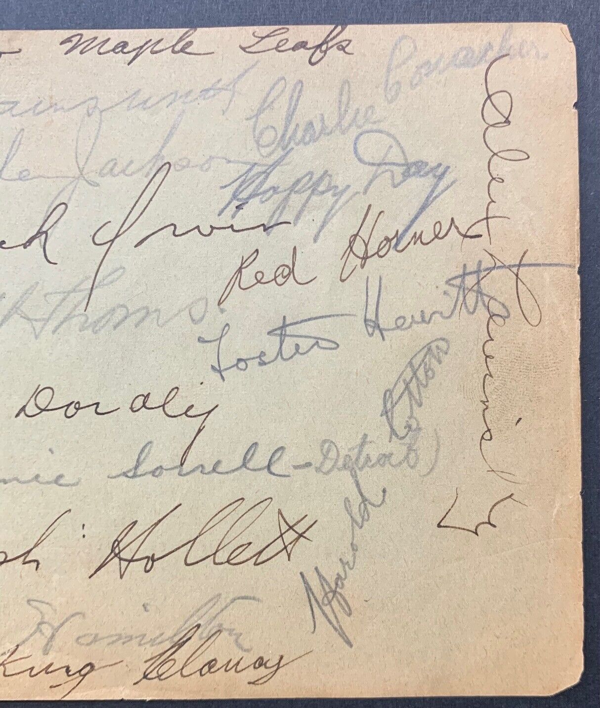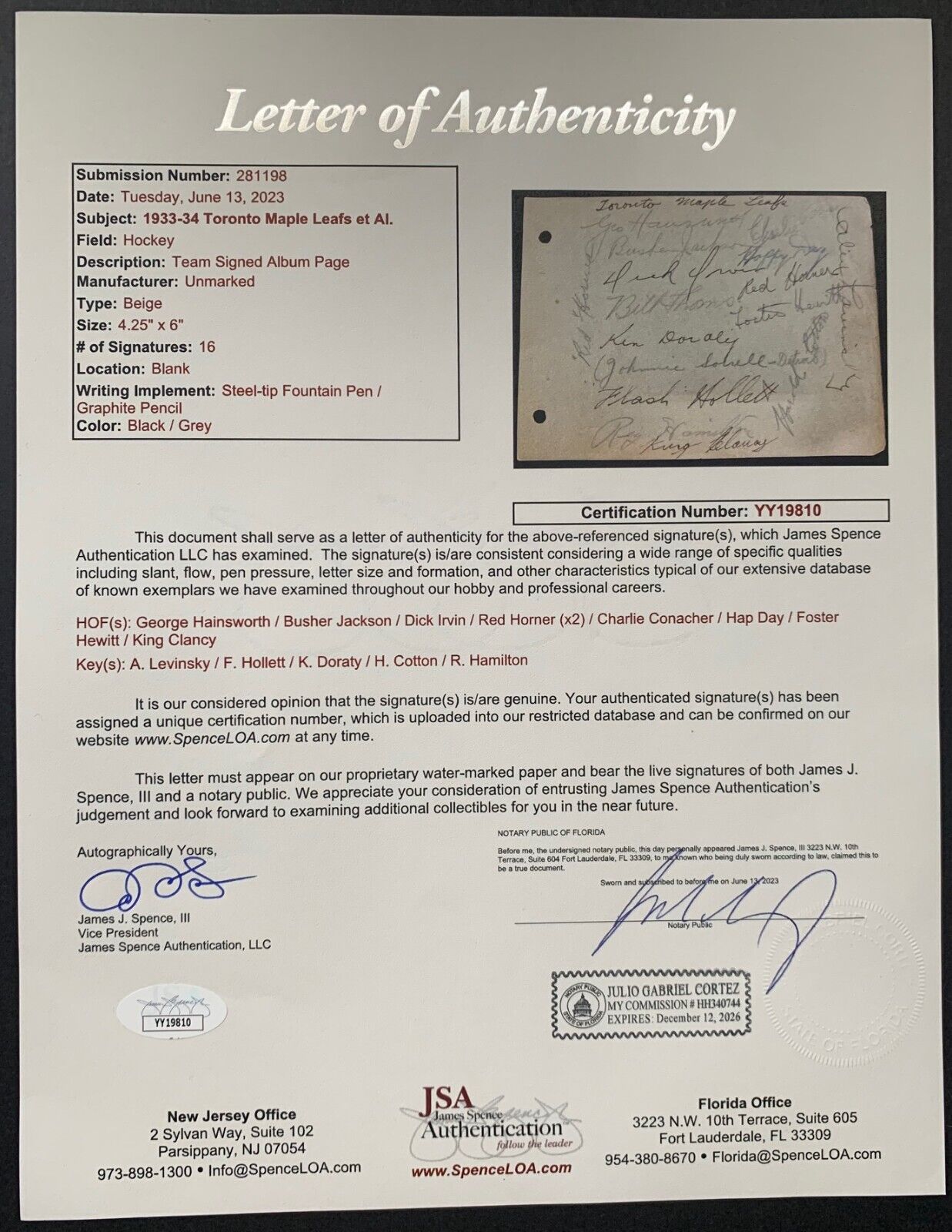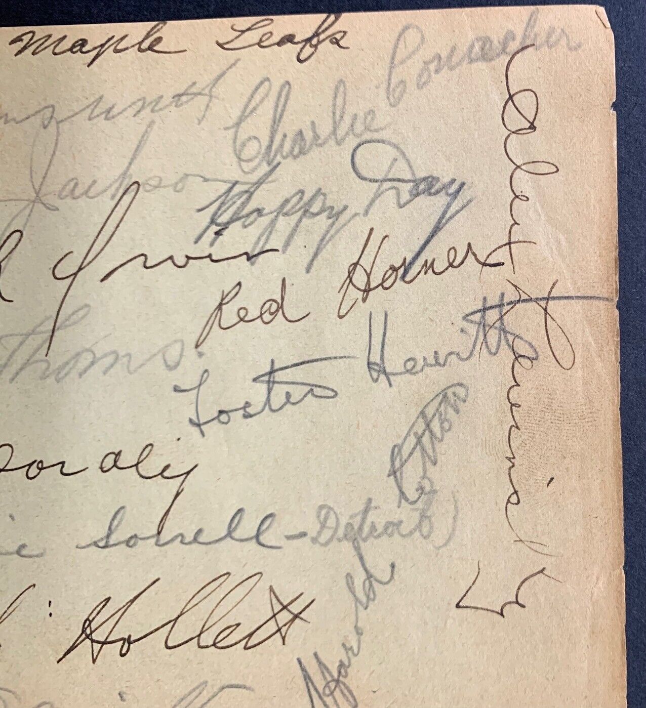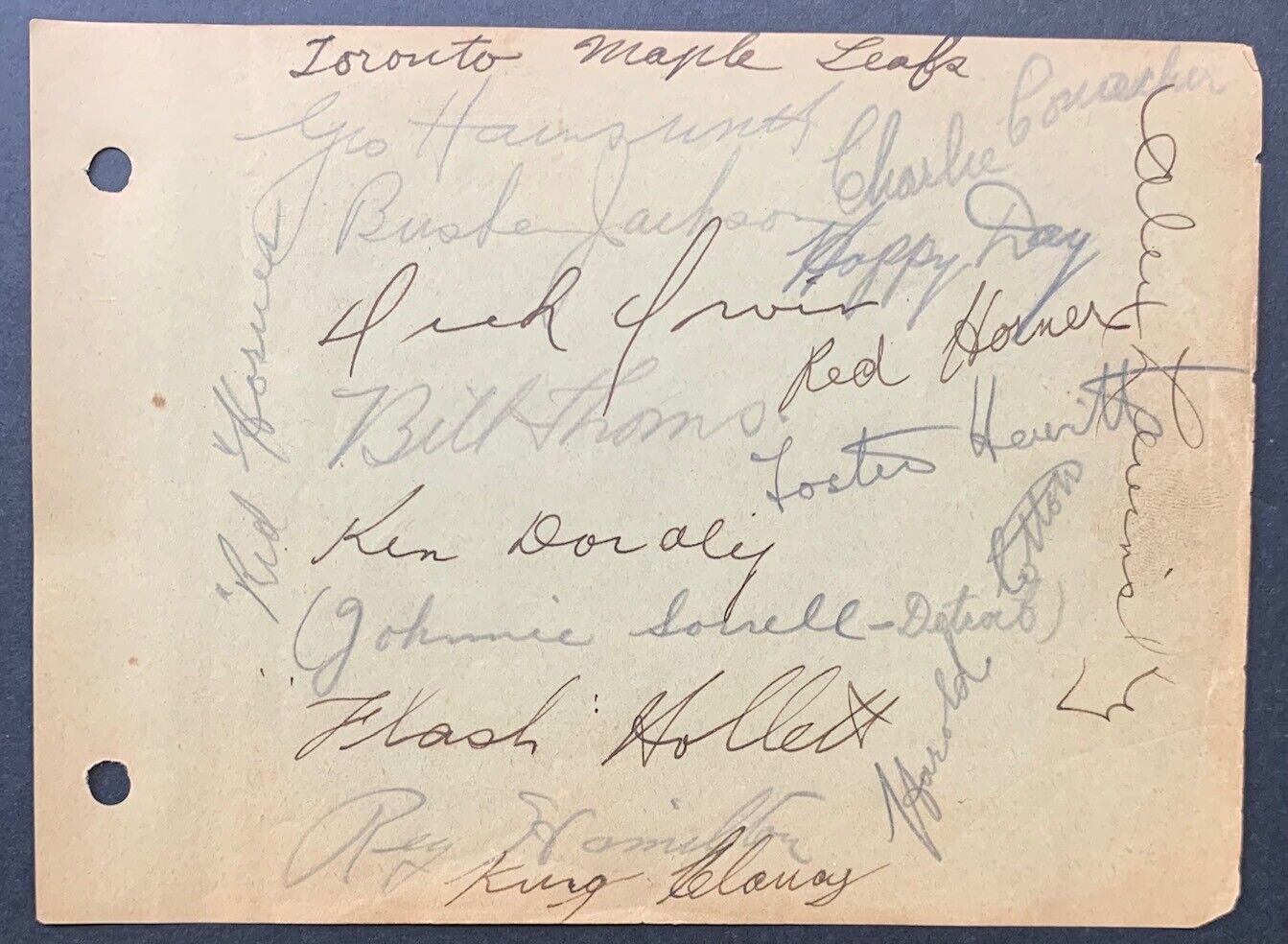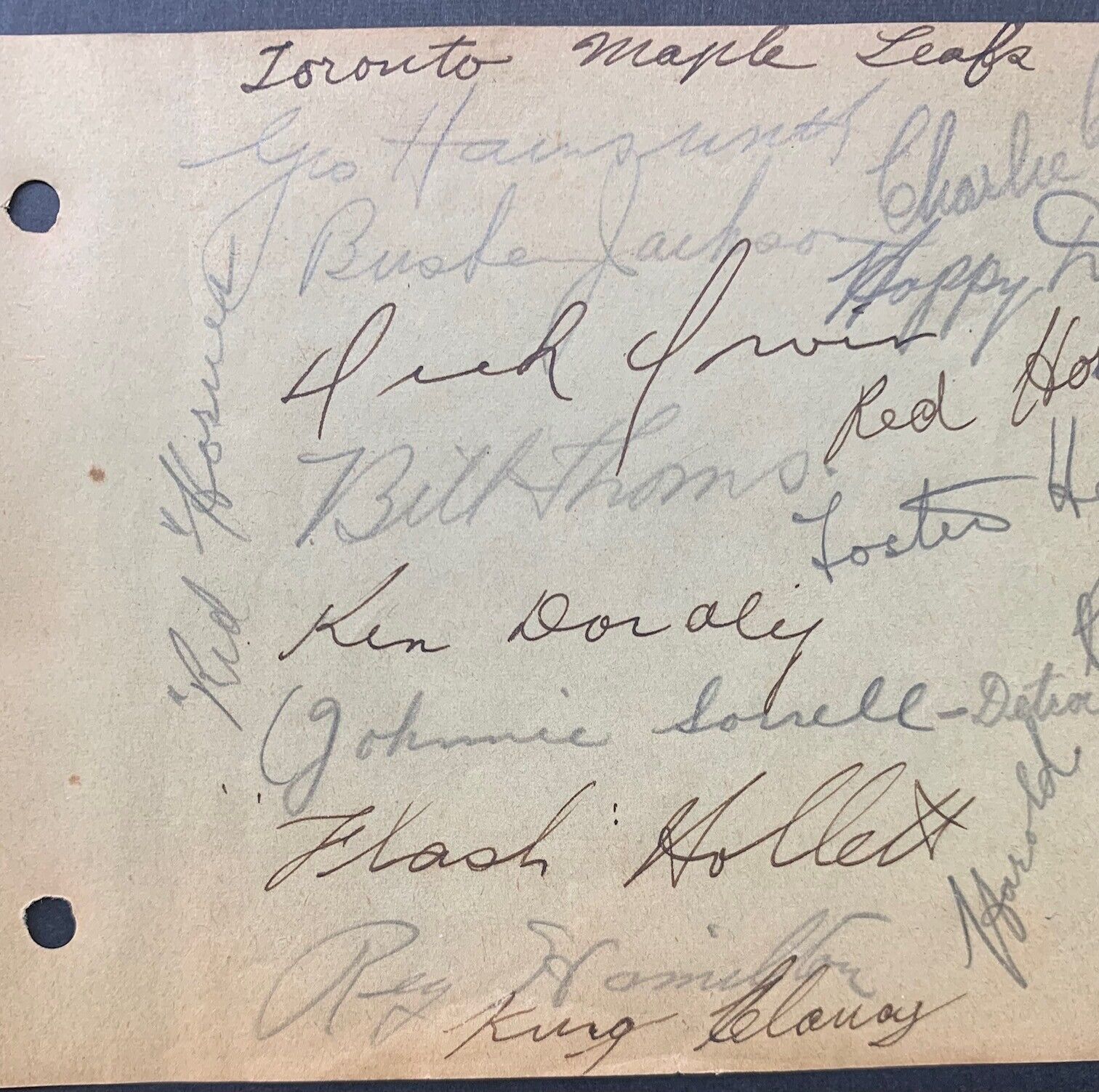 - Page signed by Hall of Famers George Hainsworth, Busher Jackson, Dick Irvin, Red Horner (x2), Charlie Conacher, Hap Day, Foster Hewitt and King Clancy. Other signatures include Bill Thoms, Johnnie Sorrell, Alex Levinsky, Flash Hollet, Ken Doraty, Harold "Baldy" Cotton and R.Hamilton
